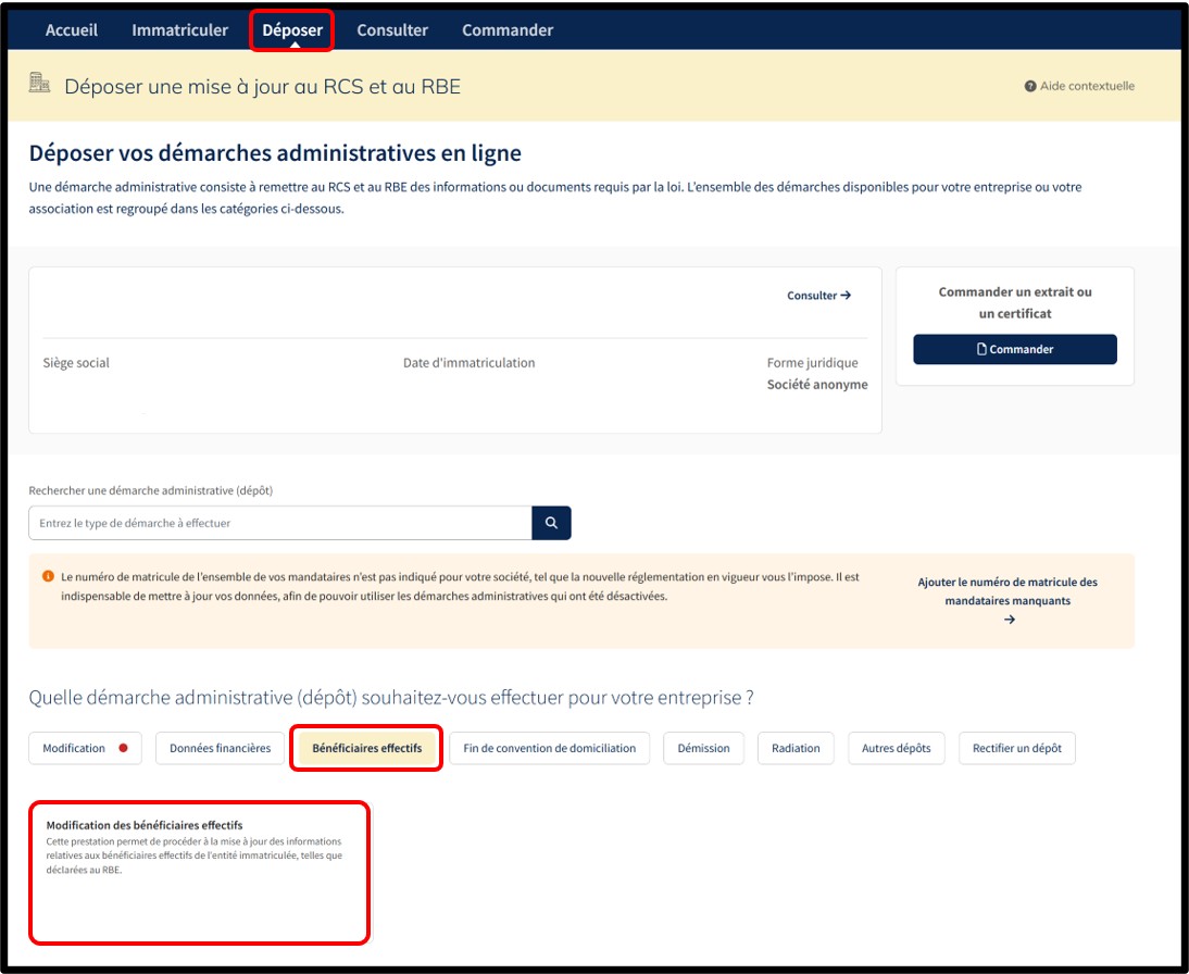 Les entités immatriculées au RCS souhaitant modifier les informations relatives à leur(s) bénéficiaire(s) effectif(s) doivent effectuer une déclaration de modification auprès du RBE par le biais de la démarche Bénéficiaires effectifs, en sélectionnant la prestation Modification des bénéficiaires effectifs.