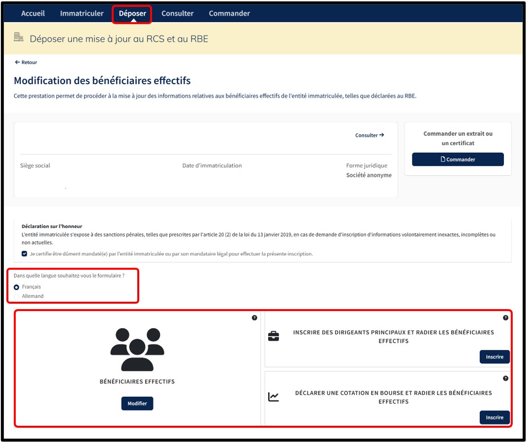 L’utilisateur valide la création de sa demande de modification en cliquant sur le bouton Modifier / Inscrire correspondant au type de modification qu'il souhaite déposer auprès du RBE. L’utilisateur est ensuite redirigé vers le formulaire de saisie correspondant à la prestation choisie.