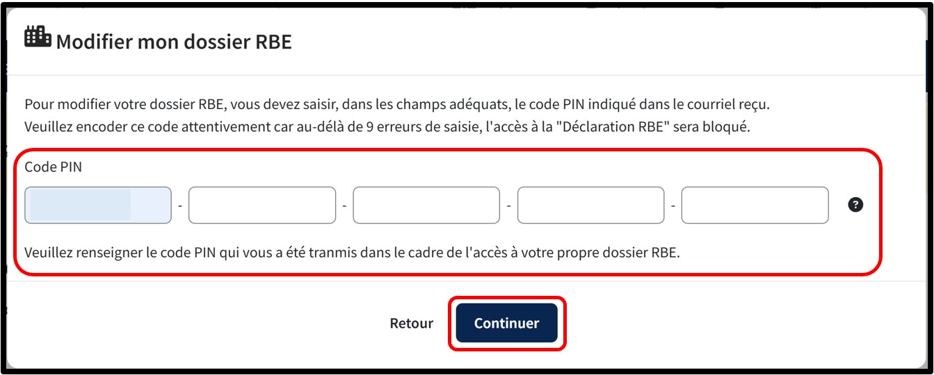 Une fois la case Déclaration sur l’honneur cochée, l'utilisateur accède à un pop-up lui permettant de renseigner au sein du champ Code PIN, le code PIN qui lui a été transmis par courrier dans le cadre de l’accès à son propre dossier RBE.