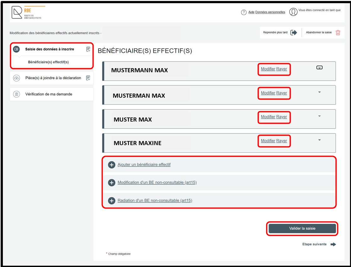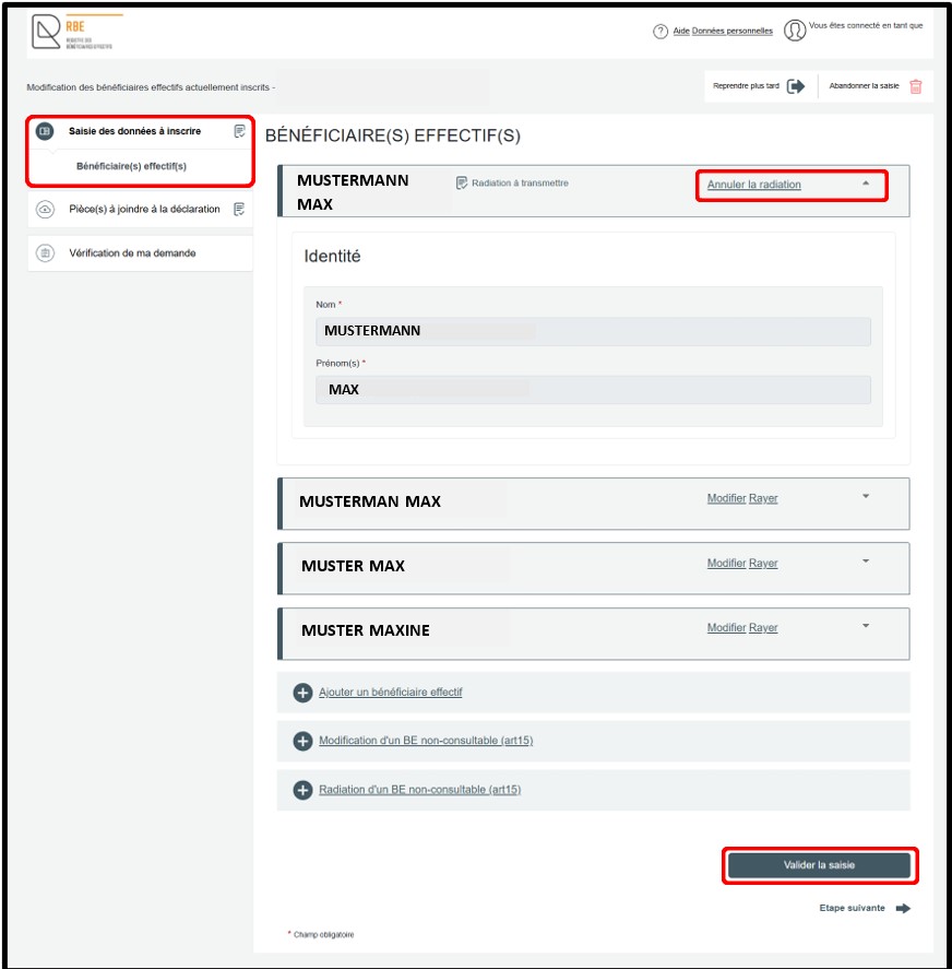 Sans cette action, il est impossible pour l’utilisateur de poursuivre la démarche de modification des bénéficiaires effectifs.