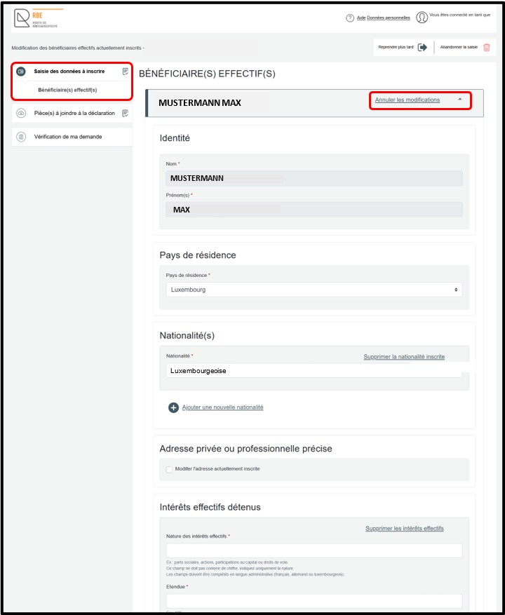 Afin de procéder à la modification d’une ou de plusieurs données concernant le bénéficiaire effectif, l’utilisateur doit cliquer sur l’option Modifier. En cliquant sur cette option, l’utilisateur libère les champs de saisie disponibles à la modification, lui permettant de procéder aux modifications souhaitées. L'utilisateur est invité à cliquer dans le champ de saisie pour activer le curseur et ainsi lui permettre la modification de la donnée.
