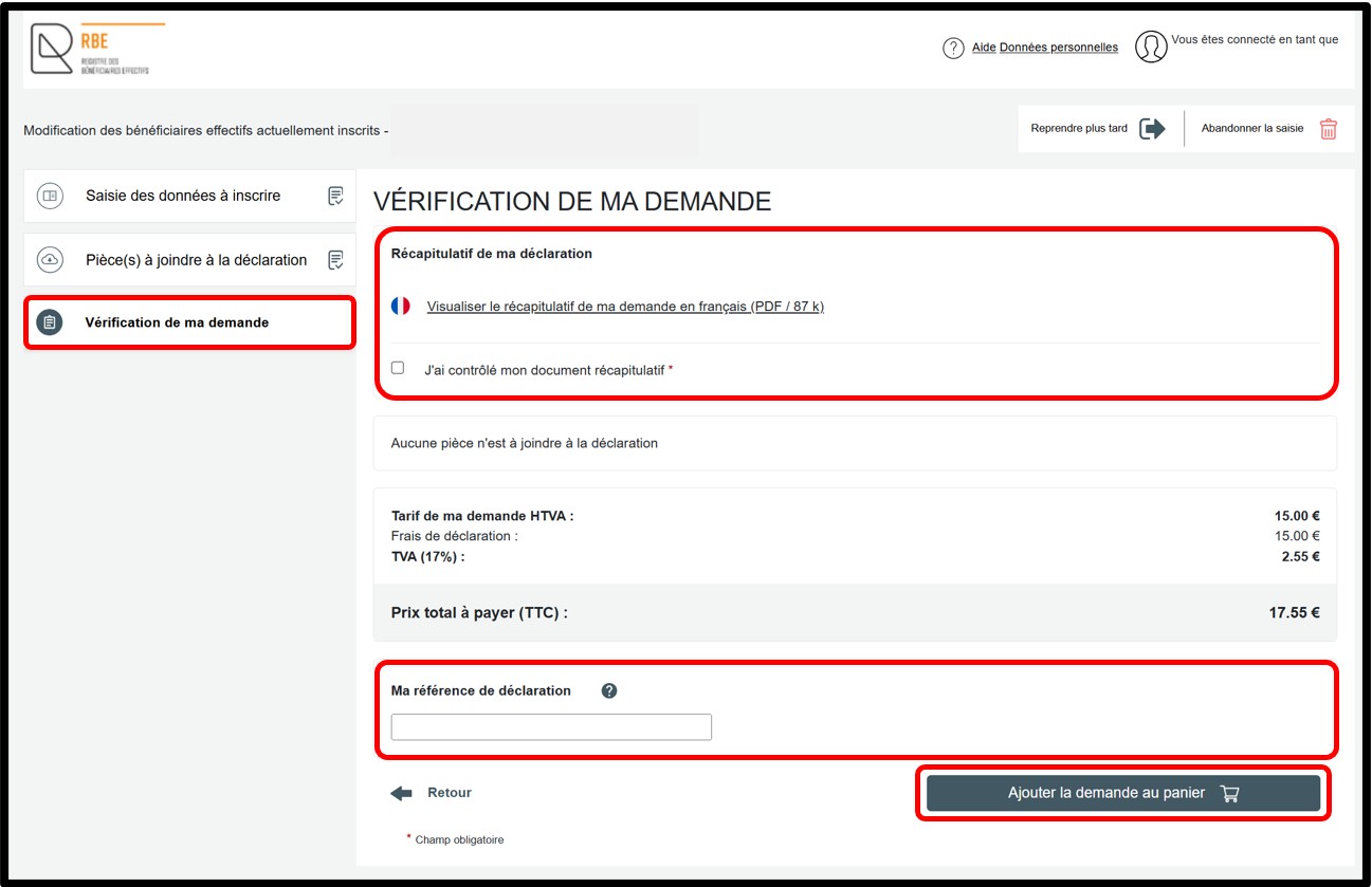 La rubrique Vérification de ma demande reprend le récapitulatif de la déclaration à des fins de vérification par l’utilisateur avant que celle-ci soit transmise au panier.
