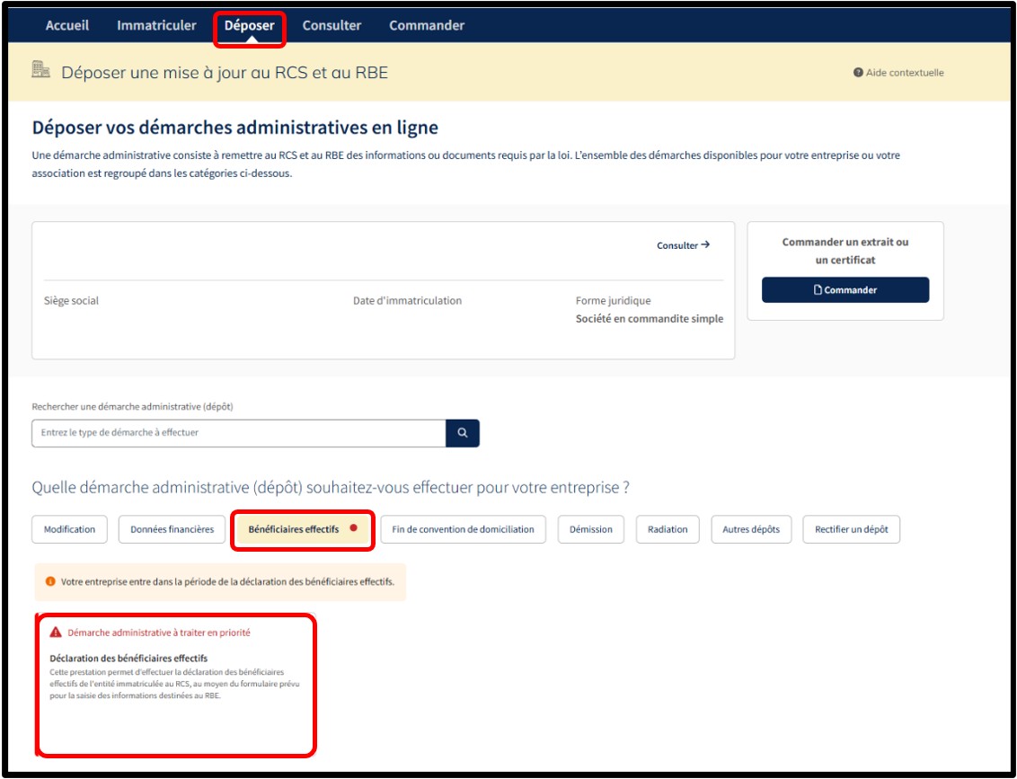 Pour réaliser cette démarche, l'entité doit effectuer une déclaration des bénéficiaires effectifs au RBE par le biais de la démarche Bénéficiaires effectifs, en sélectionnant la prestation Déclaration des bénéficiaires effectifs.