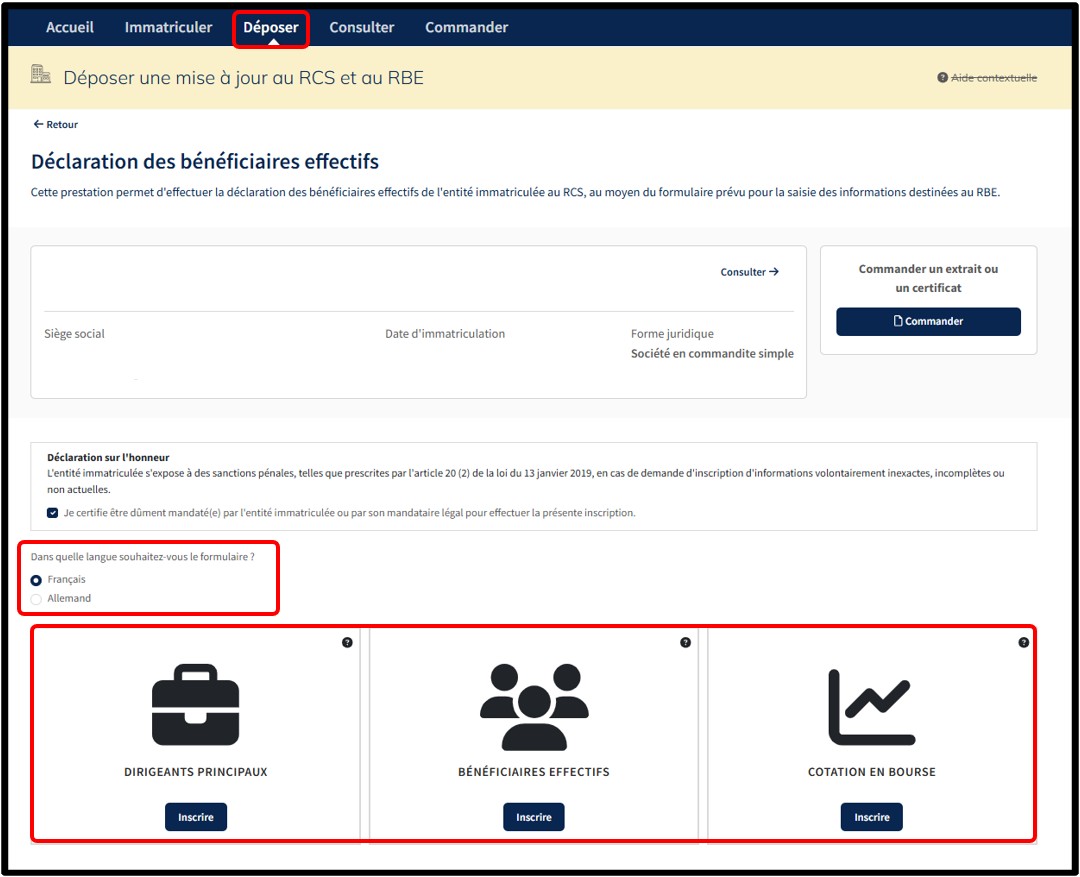 L’utilisateur valide la création de sa demande de déclaration en cliquant sur le bouton Inscrire correspondant à la catégorie de bénéficiaires effectifs qu'il souhaite déclarer.