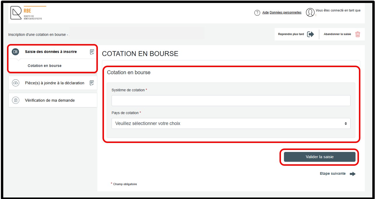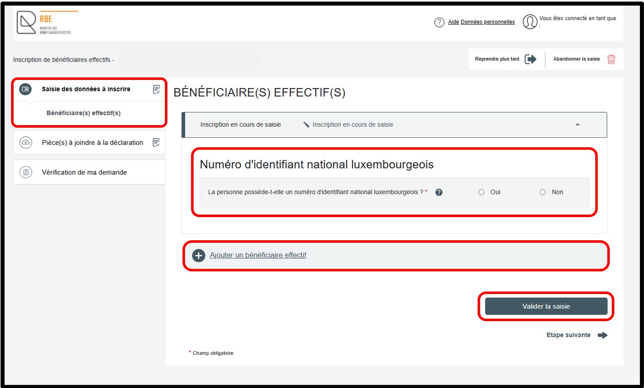 Sans cette action, il est impossible pour l’utilisateur de poursuivre la démarche de déclaration des bénéficiaires effectifs.