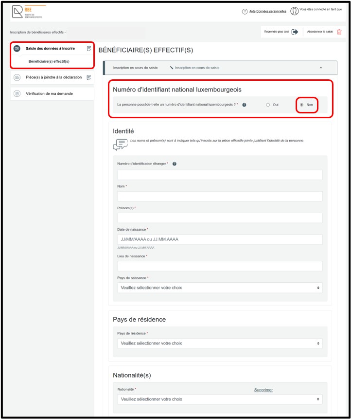 - La case Non, si la personne à déclarer ne dispose pas d'un numéro d'identification national luxembourgeois.
