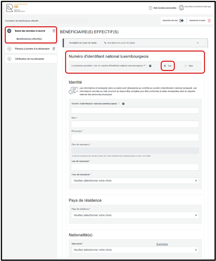 Si la personne dispose d’un numéro d’identification national luxembourgeois, l’information à communiquer au RBE doit être conforme aux inscriptions figurant au Registre national des personnes physiques.