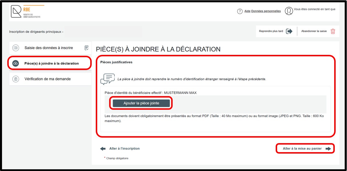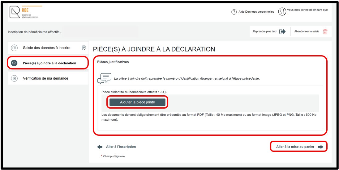 Au sein de la rubrique Pièce(s) à joindre à la déclaration, l'utilisateur doit obligatoirement joindre la pièce justificative requise au sein du champ Pièces justificatives en cliquant sur le bouton Ajouter la pièce jointe. La liste des documents à joindre est proposée en fonction des informations renseignées dans la rubrique Saisie des données à inscrire. Pour poursuivre la déclaration, l'utilisateur doit ensuite cliquer sur le lien Aller à la mise au panier.