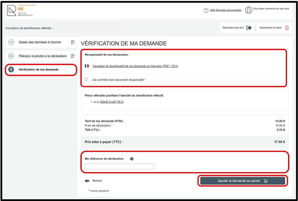 Après validation de la saisie, l’utilisateur peut accéder à l’étape suivante en cliquant sur la rubrique Vérification de ma demande. Dans le cas où le bénéficiaire effectif dispose d'un numéro d'identification national luxembourgeois, aucune pièce justificative n'est requise pour compléter la déclaration.