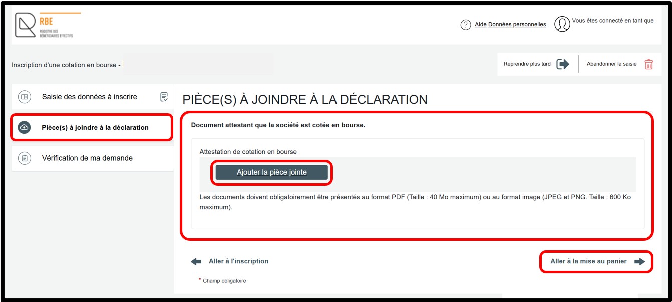 Au sein de la rubrique Pièce(s) à joindre à la déclaration, l'utilisateur doit obligatoirement joindre l'attestation requise au sein du champ Documents attestant que la société est cotée en bourse en cliquant sur le bouton Ajouter la pièce jointe. Pour poursuivre la déclaration, l'utilisateur doit ensuite cliquer sur le lien Aller à la mise au panier.
