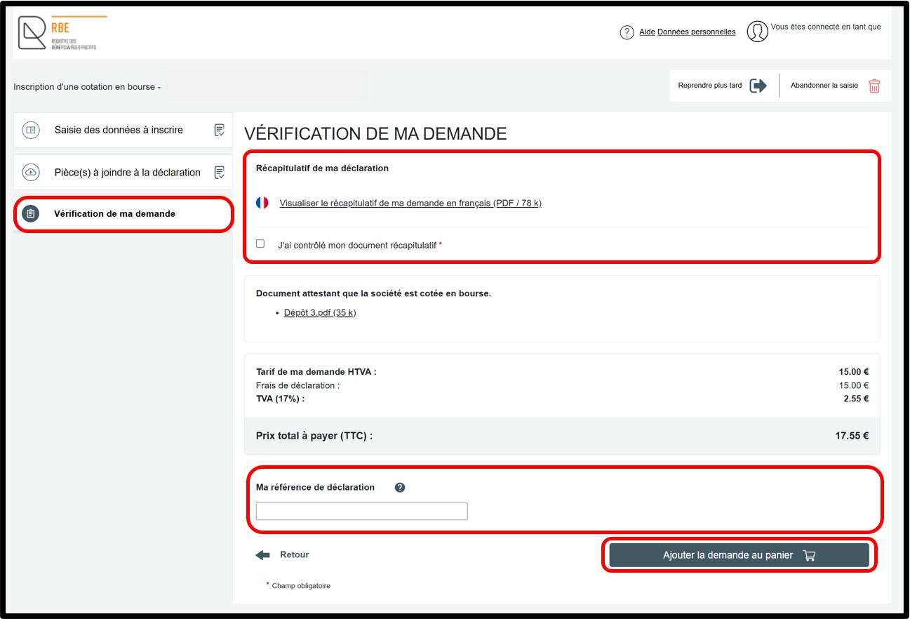 La rubrique Vérification de ma demande reprend le récapitulatif de la déclaration à des fins de vérification par l’utilisateur avant que celle-ci soit transmise au panier.