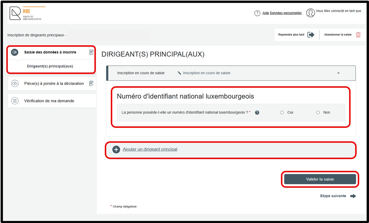 Après validation de la saisie, l’utilisateur peut accéder à l’étape suivante en cliquant sur la rubrique Vérification de ma demande. Dans le cas où le dirigeant principal dispose d'un numéro d'identification national luxembourgeois, aucune pièce justificative n'est requise pour compléter la déclaration.