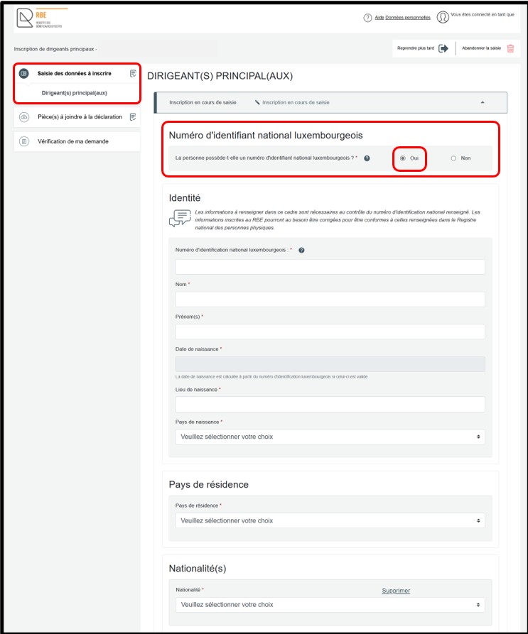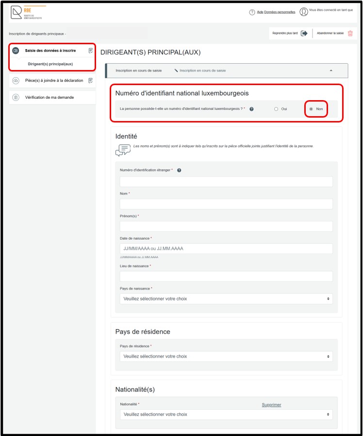 - Pour le bénéficiaire effectif ou dirigeant principal ne disposant pas d’un numéro d’identification national luxembourgeois, l’information à communiquer doit être conforme à la pièce justificative qui sera à joindre, permettant d’établir l’identité de la personne. Si la personne a plusieurs prénoms, ils sont tous à indiquer sur le formulaire. En ce qui concerne le champ relatif au nom, il convient de reprendre l’information telle qu’elle figure sur la pièce officielle justificative. A noter que les caractères tels que les guillemets, les virgules ou les parenthèses ne sont pas à inscrire dans ces champs.