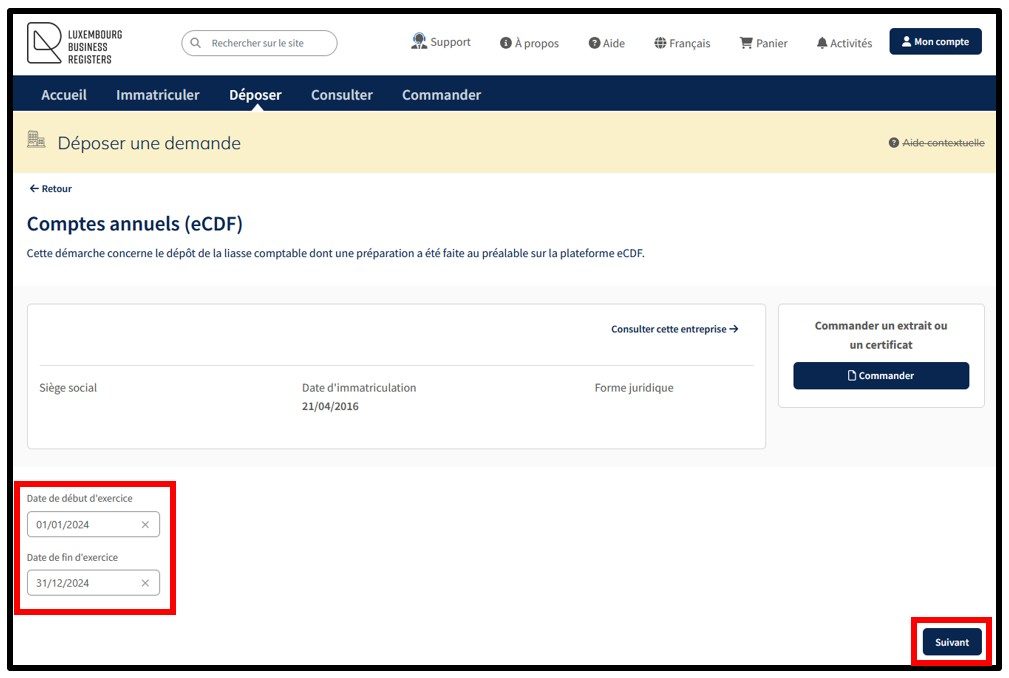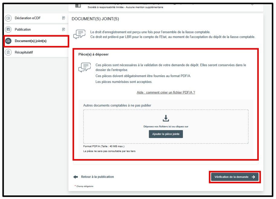 L’utilisateur peut ensuite, lors de la création de sa demande de dépôt au RCS, directement récupérer les données validées auparavant sur la plateforme eCDF. Il doit également y joindre, au format PDF/A, les éventuels autres documents requis par la loi tels que l’annexe, le rapport de gestion ou de contrôle…).