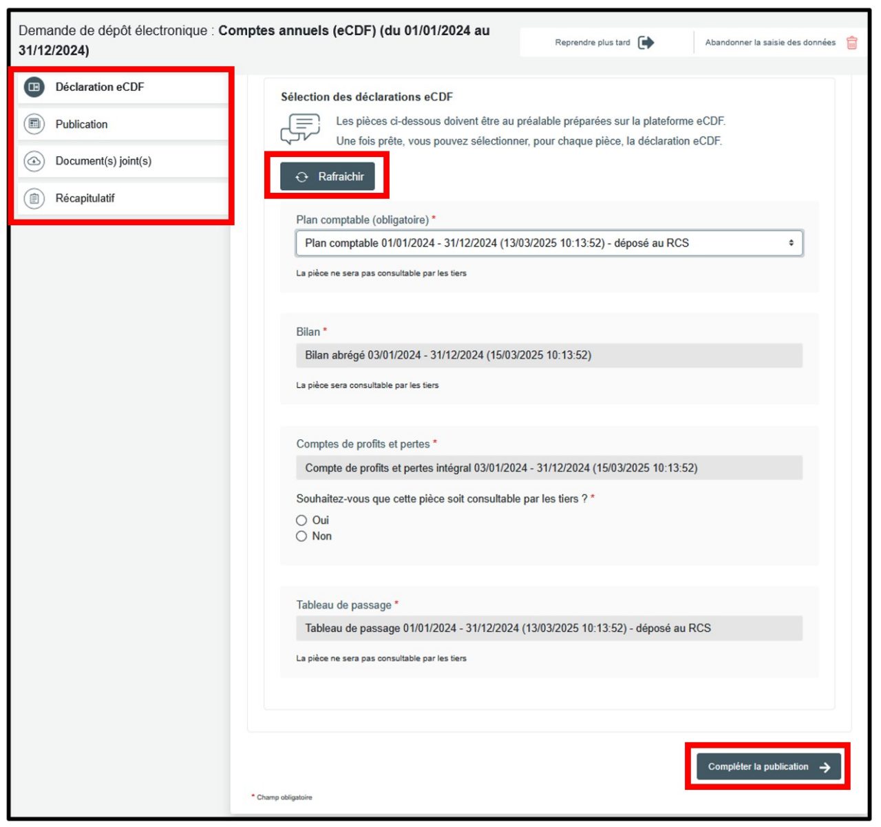 - Saisie des données financières via les formulaires normalisés disponibles sur la plateforme eCDF.