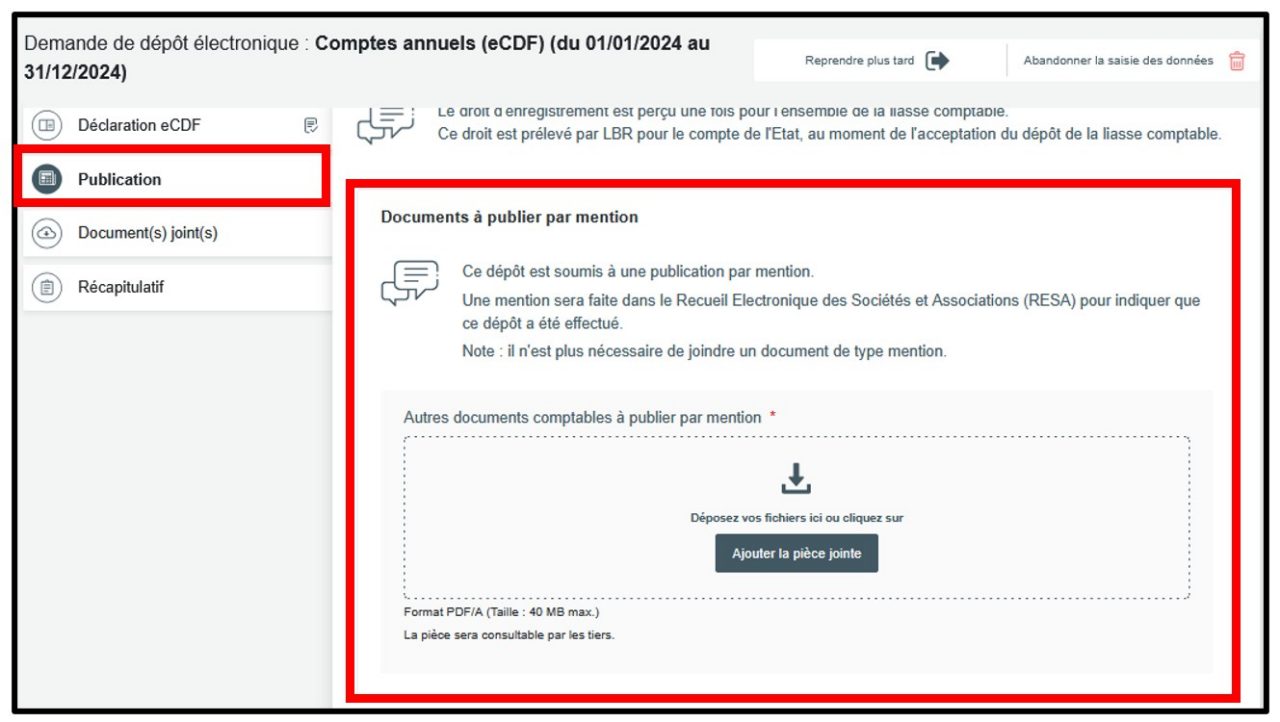 Les autres documents comptables à déposer au RCS, dont la loi prévoit la publication au RESA, sont à joindre sous la rubrique Publication au sein du champ Documents à publier par mention.