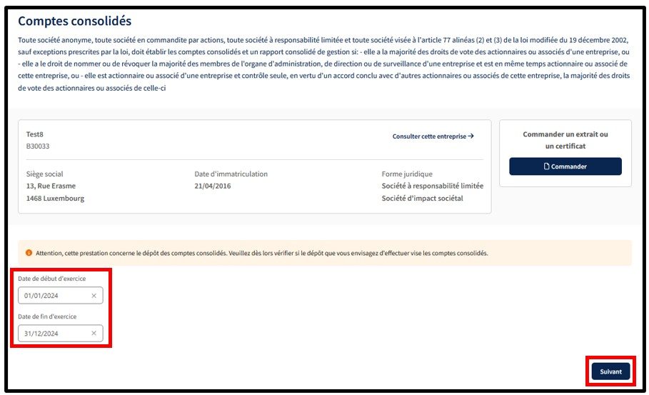 L’utilisateur doit, dans un premier temps, encoder la date de début et la date de fin de l’exercice des comptes consolidés déposés. Les dates doivent être conformes à celles mentionnées sur les documents joints à la demande.