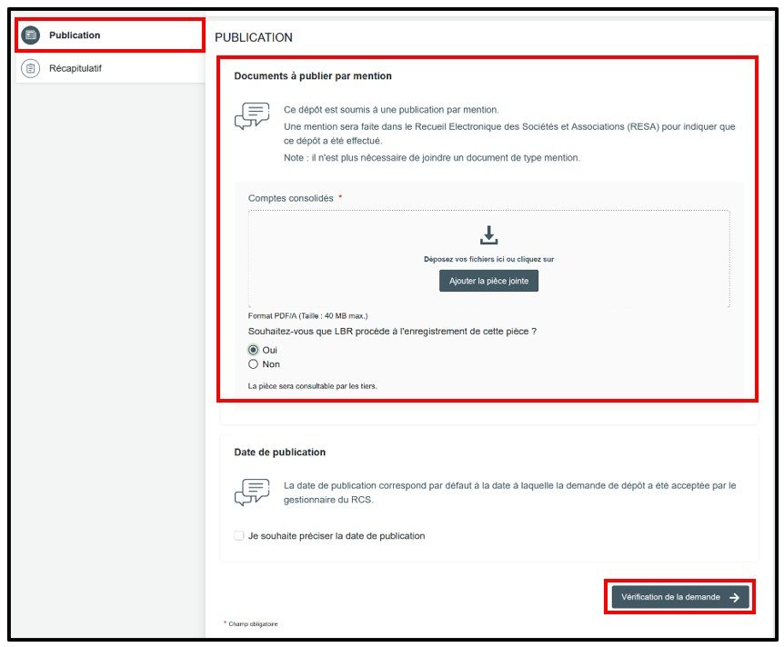 Les comptes consolidés, dont la loi prévoit la publication au RESA, sont à joindre sous la rubrique Publication au sein du champ Document à publier par mention.