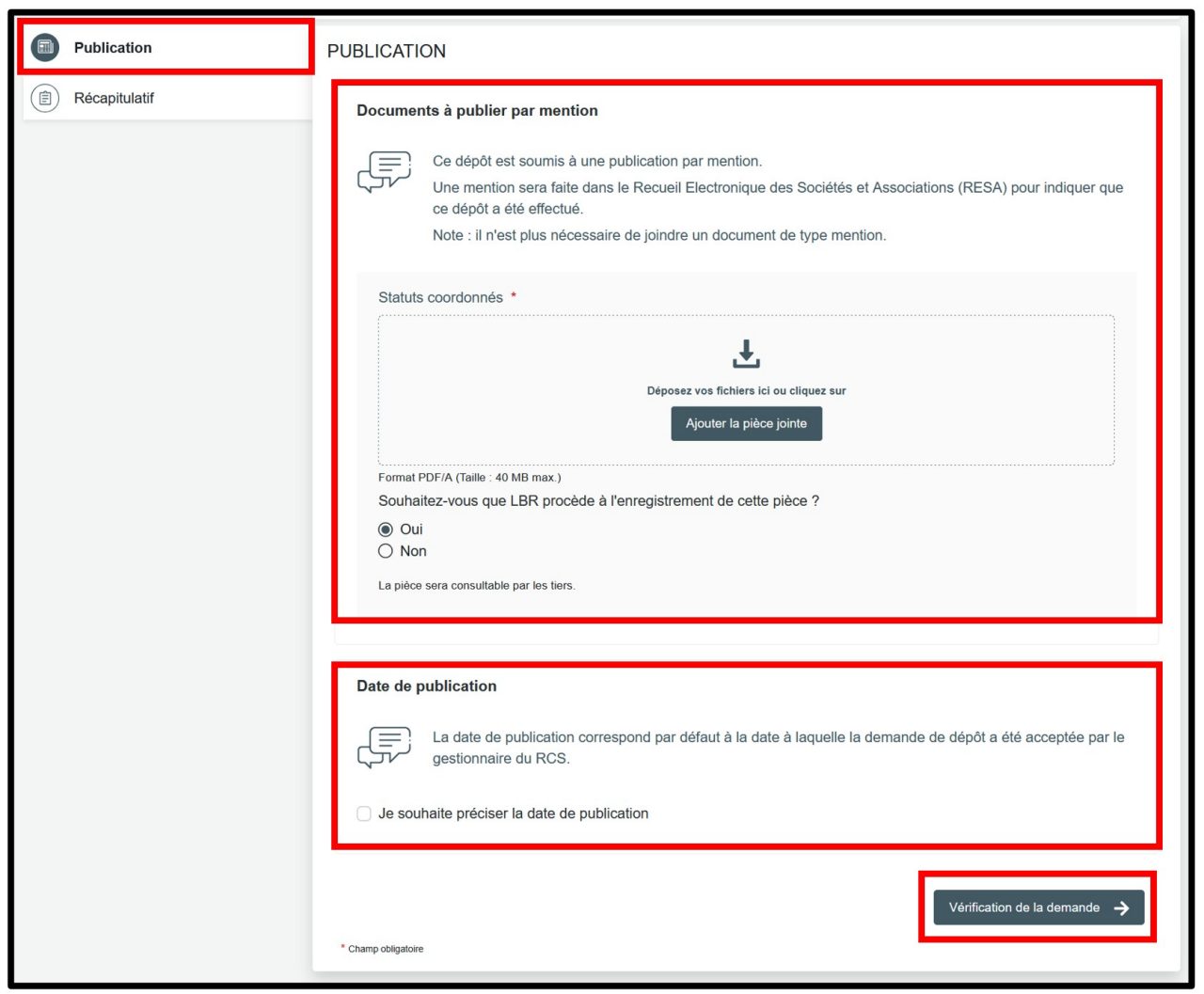 Le gestionnaire du RCS est habilité à enregistrer les documents transmis à des fins de publication. L’utilisateur a dès lors le choix d’indiquer lors de sa demande s’il souhaite ou non que LBR procède à l’enregistrement de la pièce en question. Pour ce faire, l’utilisateur est invité à cocher l’une des options disponibles.