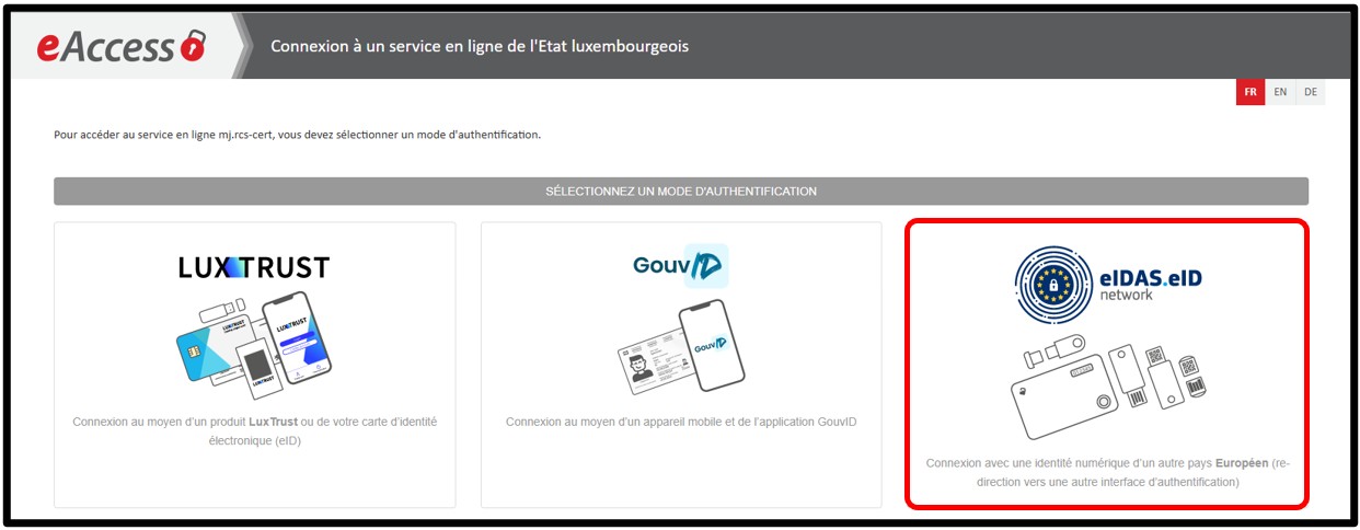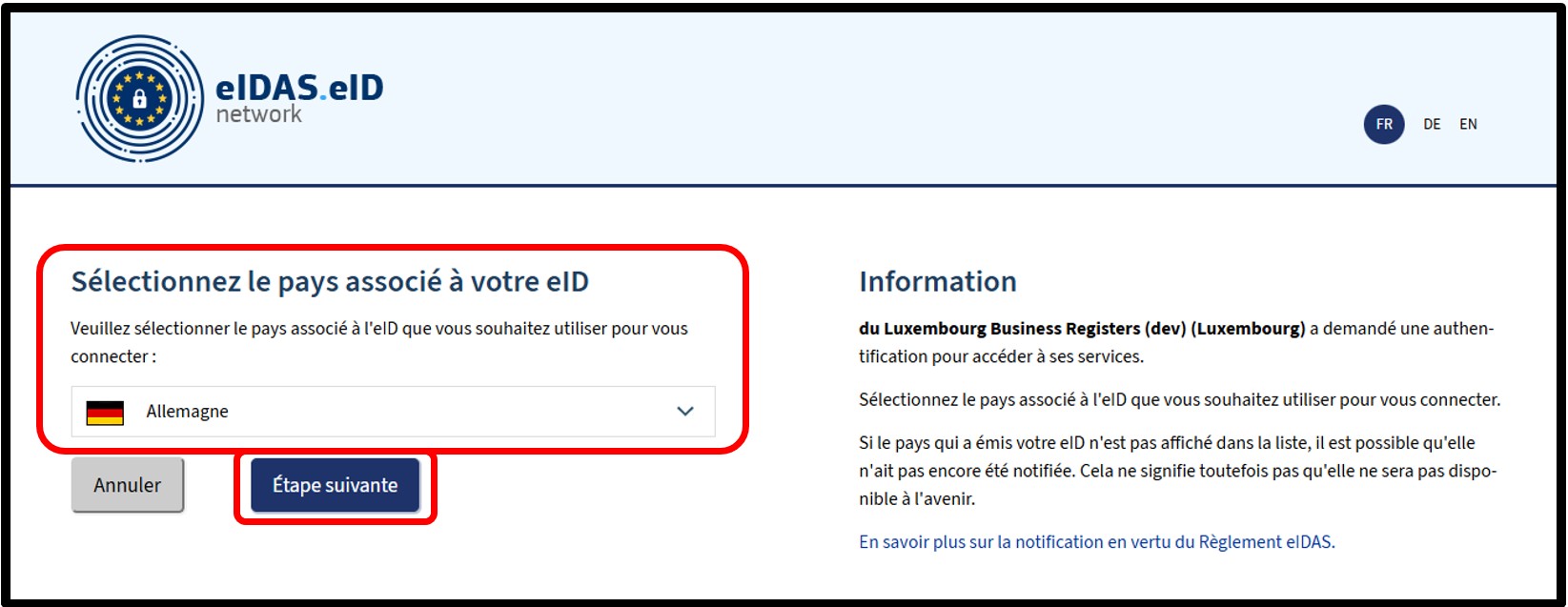 Après avoir sélectionner le mode d’authentification eIDAS, l’utilisateur doit sélectionner par le biais d’une liste déroulante, le pays associé à son certificat eIDAS qu’il souhaite utiliser pour se connecter.