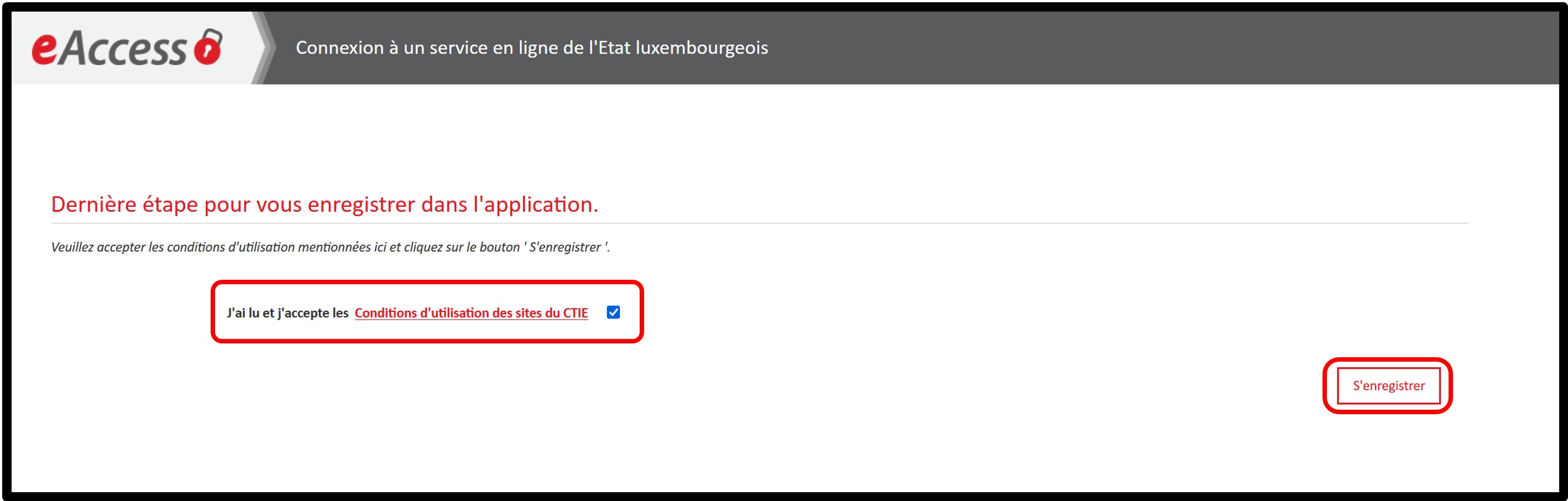 L’activation du compte n’est possible que si l’utilisateur accepte les conditions d’utilisation des sites du CTIE présentées sur cet écran en cochant la case correspondante. L’activation du compte prendra effet en cliquant alors sur le bouton S’enregistrer.