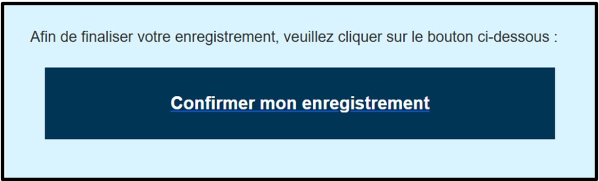 Une fois la demande d’enregistrement envoyée, l’utilisateur doit accéder à sa boîte mail dont l’adresse a été fournie au sein du formulaire de demande. Au sein du mail de confirmation de la demande, l’utilisateur valide son enregistrement en cliquant sur le lien Confirmer mon enregistrement et puis de suivre les indications affichées à l’écran.
