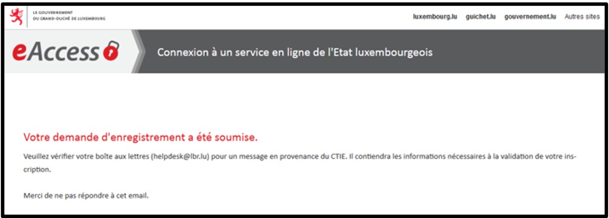 Un écran confirme que la demande d’enregistrement a bien été prise en charge. Il invite l’utilisateur à consulter sa boîte mail pour y trouver le mail de confirmation d’enregistrement.