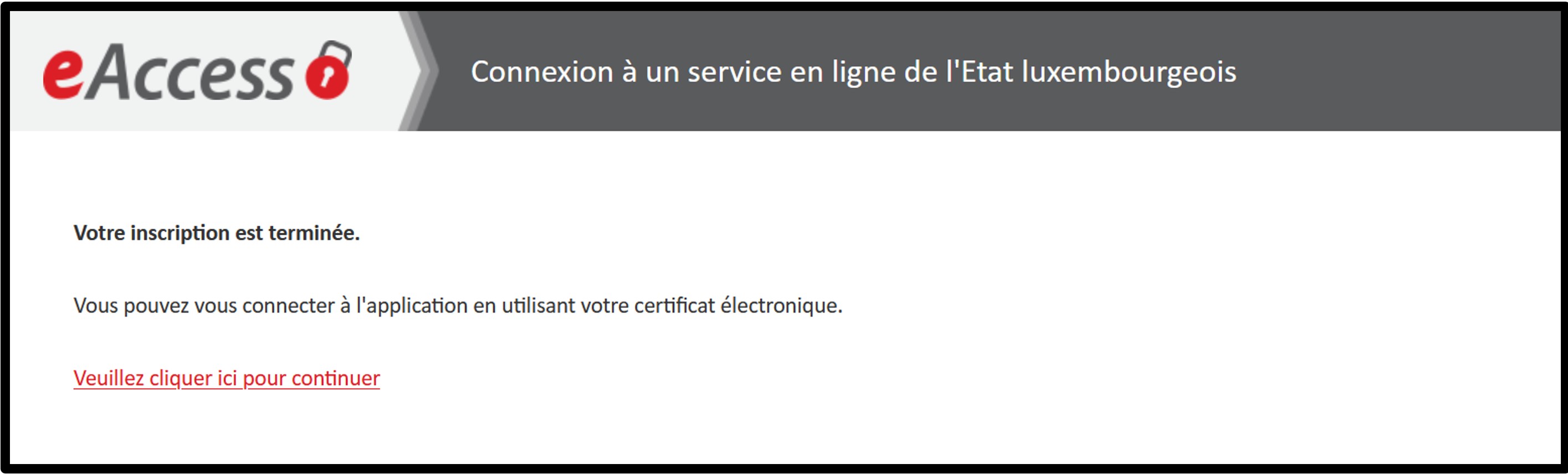 Un dernier écran est affiché indiquant que l’opération s’est déroulée avec succès. L’utilisateur est invité à cliquer sur le lien Veuillez cliquer ici pour continuer permettant de revenir à l’écran de bienvenue.