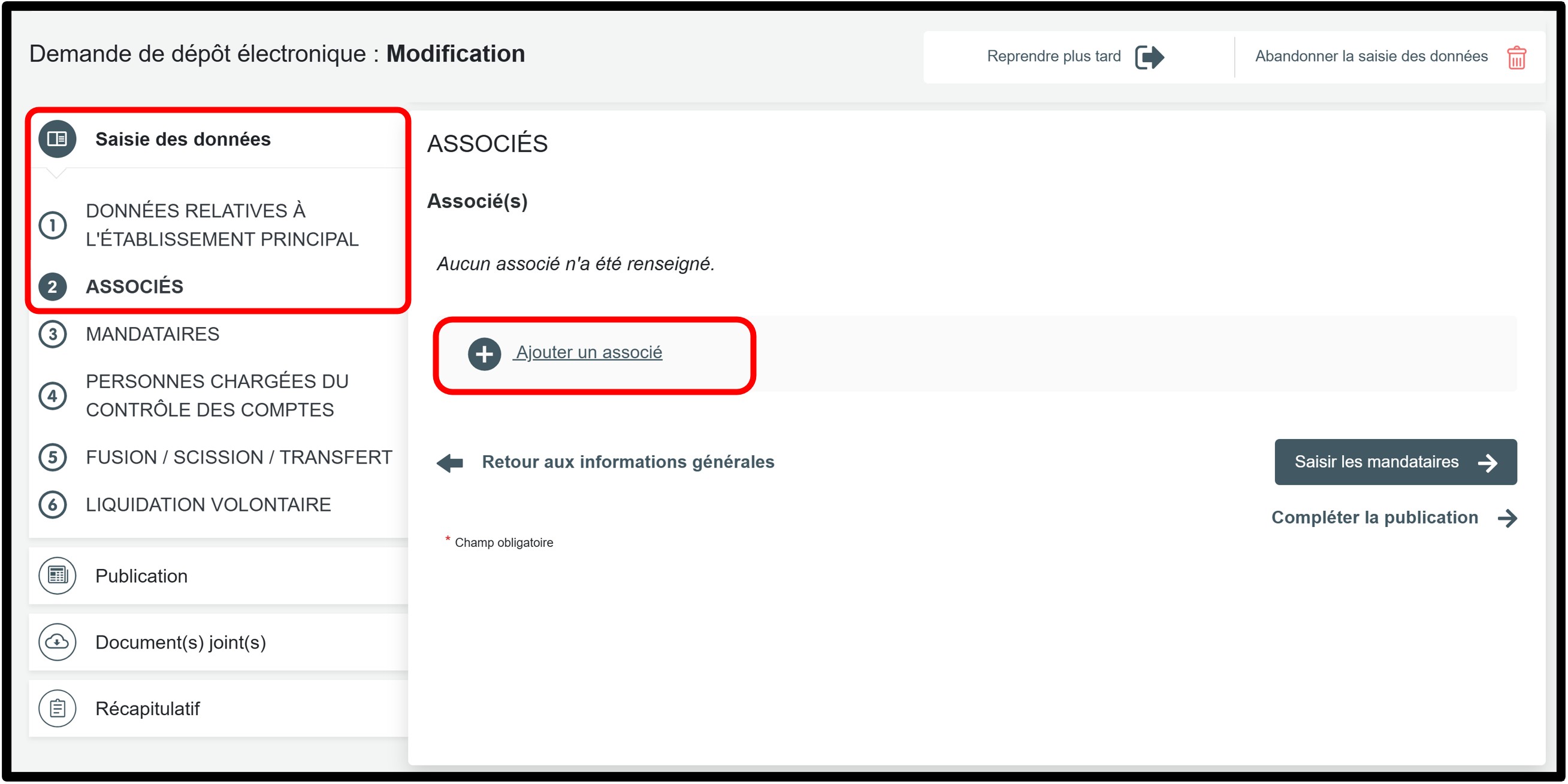 Dans la partie Saisie des données, sélectionnez la rubrique Associés pour accéder aux informations à inscrire.