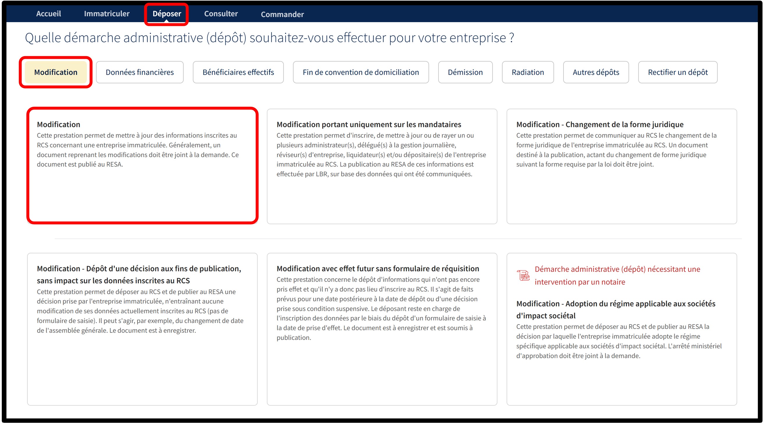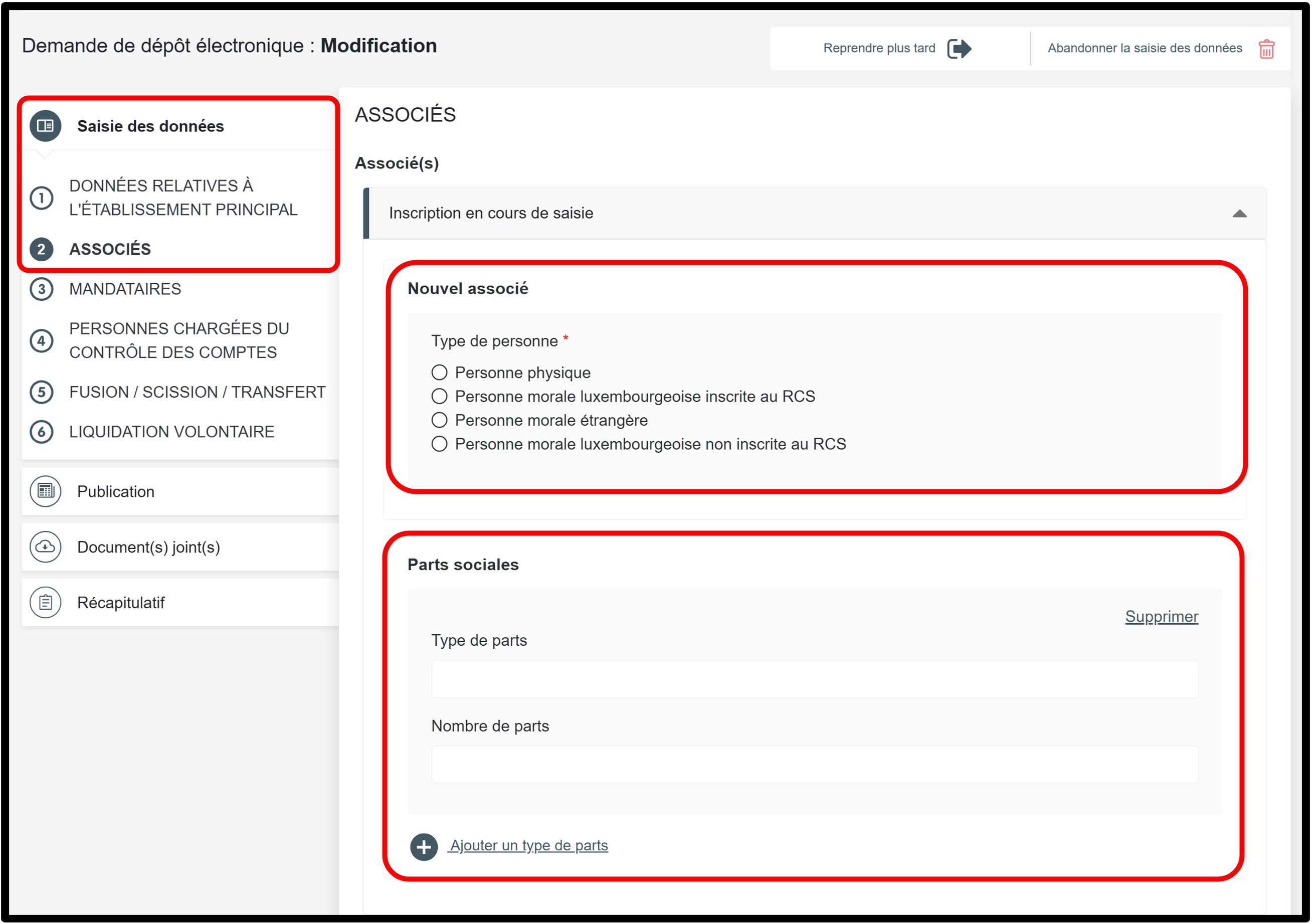 Pour inscrire un associé pour votre entité, vous devez effectuer un dépôt modificatif auprès du RCS. Cela consiste à mettre à jour la liste des associés de votre entité en y ajoutant un ou plusieurs associés, selon la situation de l'entité.