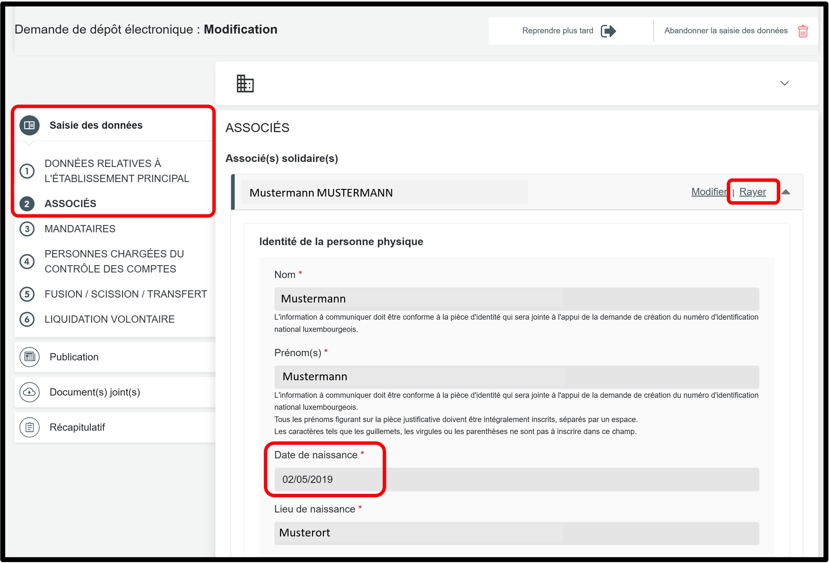 Dans la partie Saisie des données, sélectionnez la rubrique Associés pour accéder aux informations à modifier.