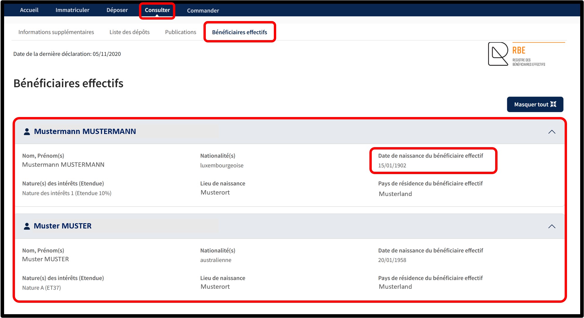 Dans l’exemple présenté dans le cadre des explications fournies, vous pouvez constater que, pour l’un des bénéficiaires effectifs, la date de naissance indiquée semble douteuse, car elle laisse apparaître un âge supérieur à cent vingt ans.