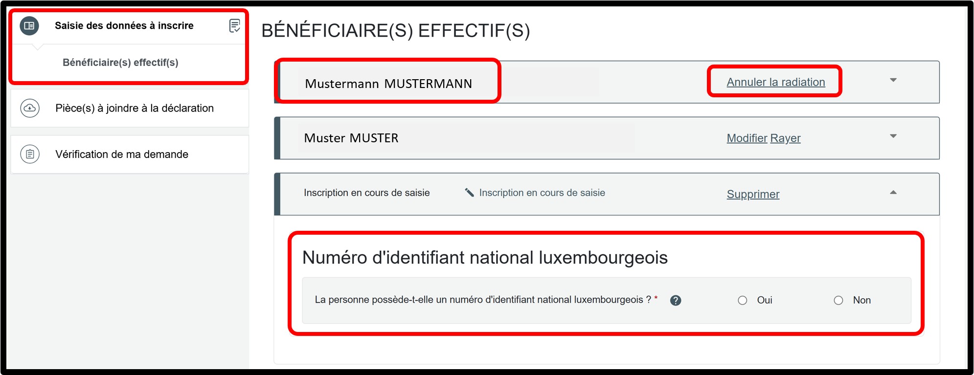 Après validation de la saisie, vous pouvez accéder à l’étape suivante en cliquant sur la rubrique Vérification de ma demande. Si le bénéficiaire effectif dispose d’un numéro d’identification national luxembourgeois, aucune pièce justificative n’est requise pour finaliser la déclaration.