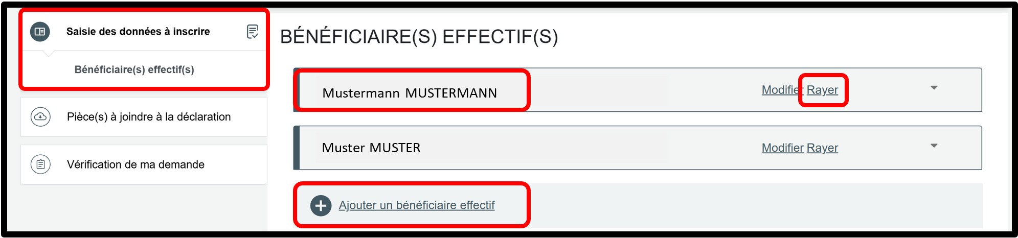 Cliquez ensuite sur l'option Ajouter un bénéficiaire effectif afin de réinscrire cette personne avec les informations correctes. Dans ce cas, vous devez à nouveau joindre les pièces justificatives requises.