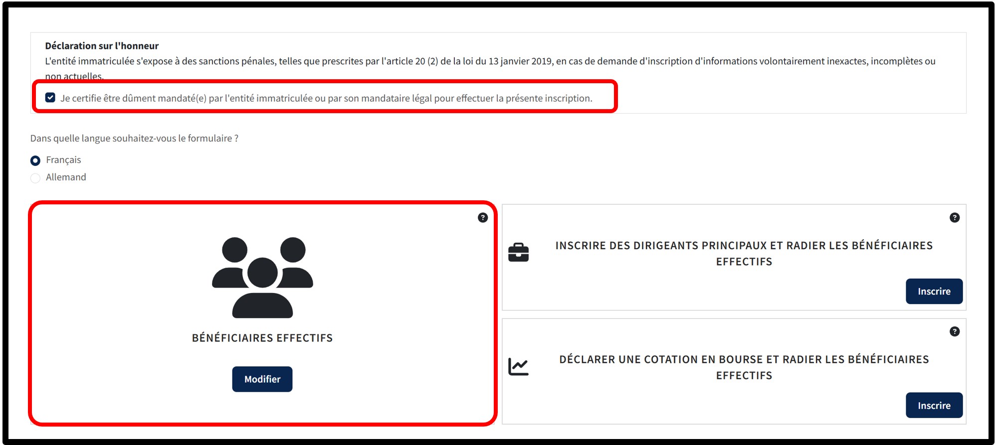 Si vous ne la cochez pas, vous ne pourrez pas continuer la démarche de modification des bénéficiaires effectifs.