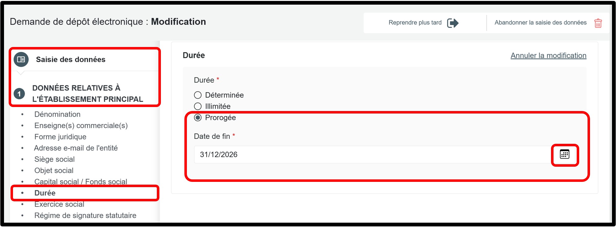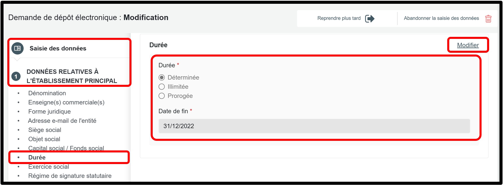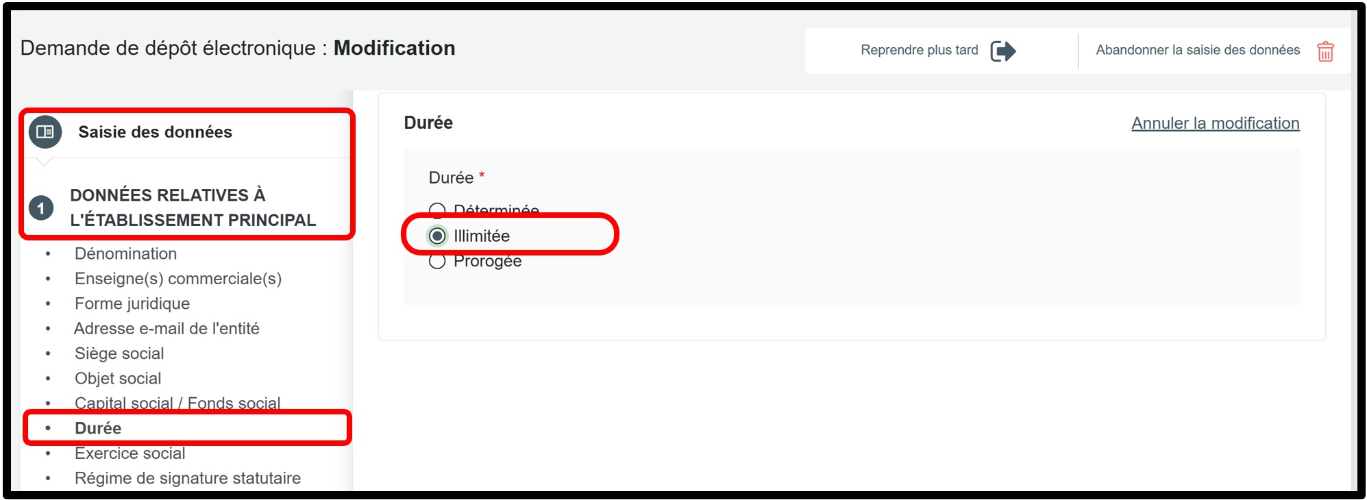 - si la durée d’existence de l’entité est désormais prévue sans limite de temps, vous devez également mettre à jour la durée d’existence conformément aux informations figurant dans l’acte de constitution.