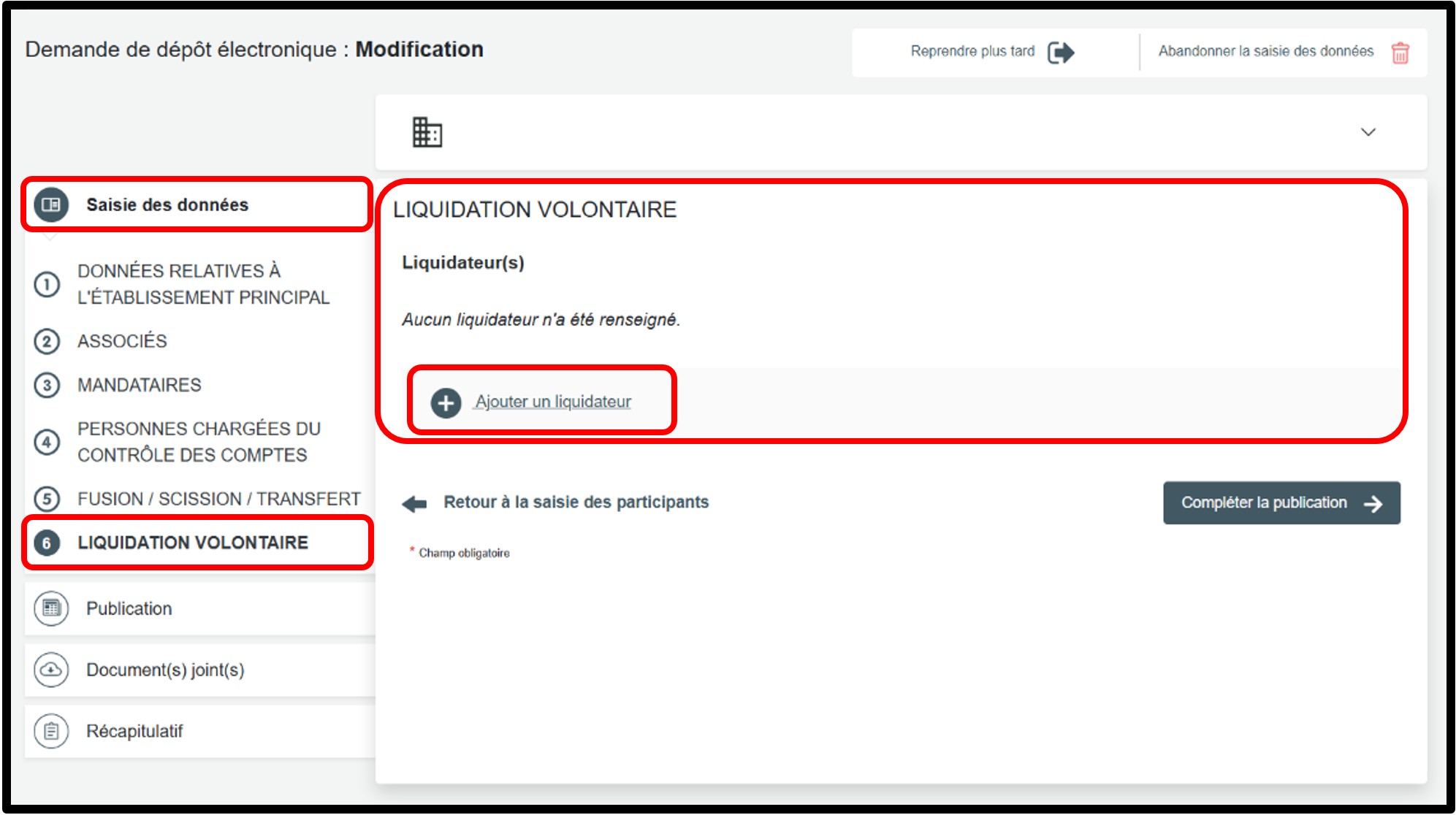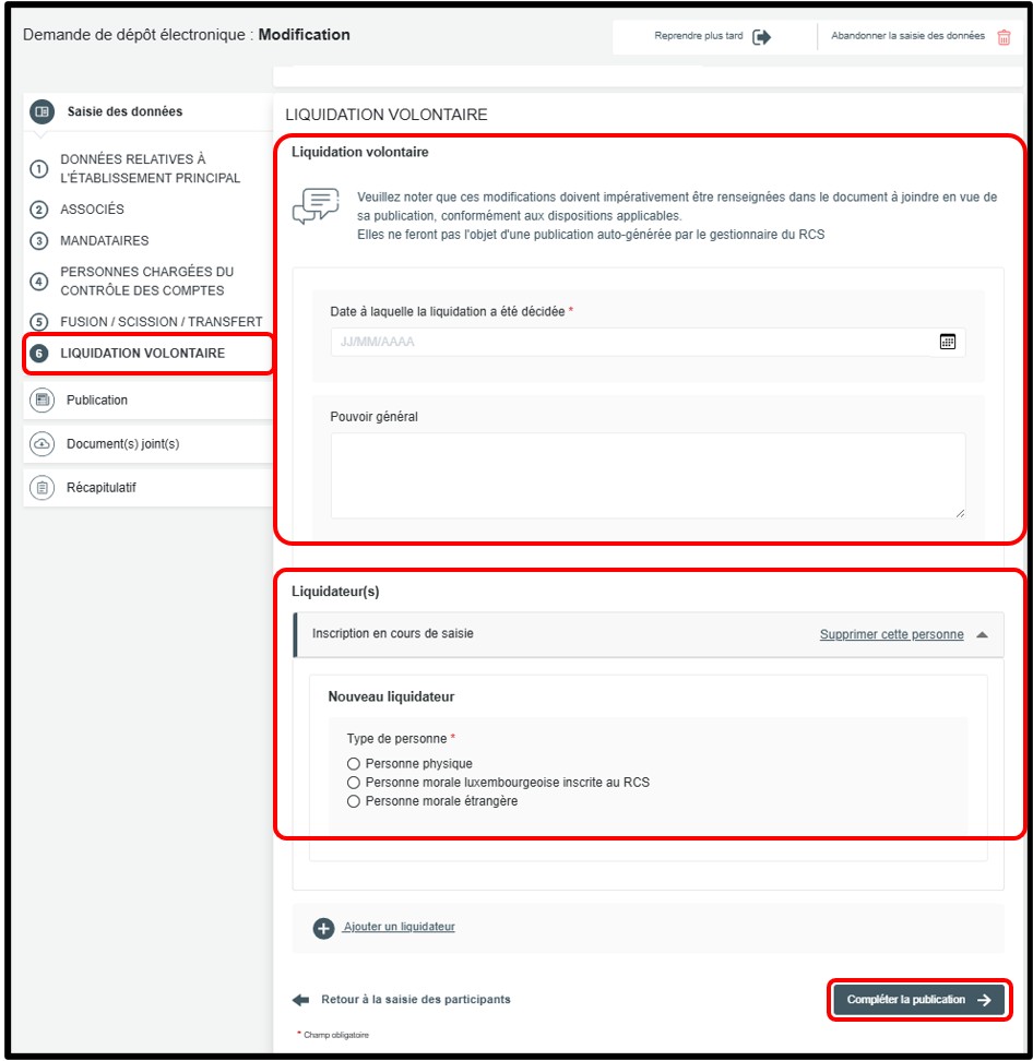 Une fois toutes les informations requises renseignées, vous pouvez poursuivre la démarche de liquidation volontaire en cliquant sur le bouton Compléter la publication.