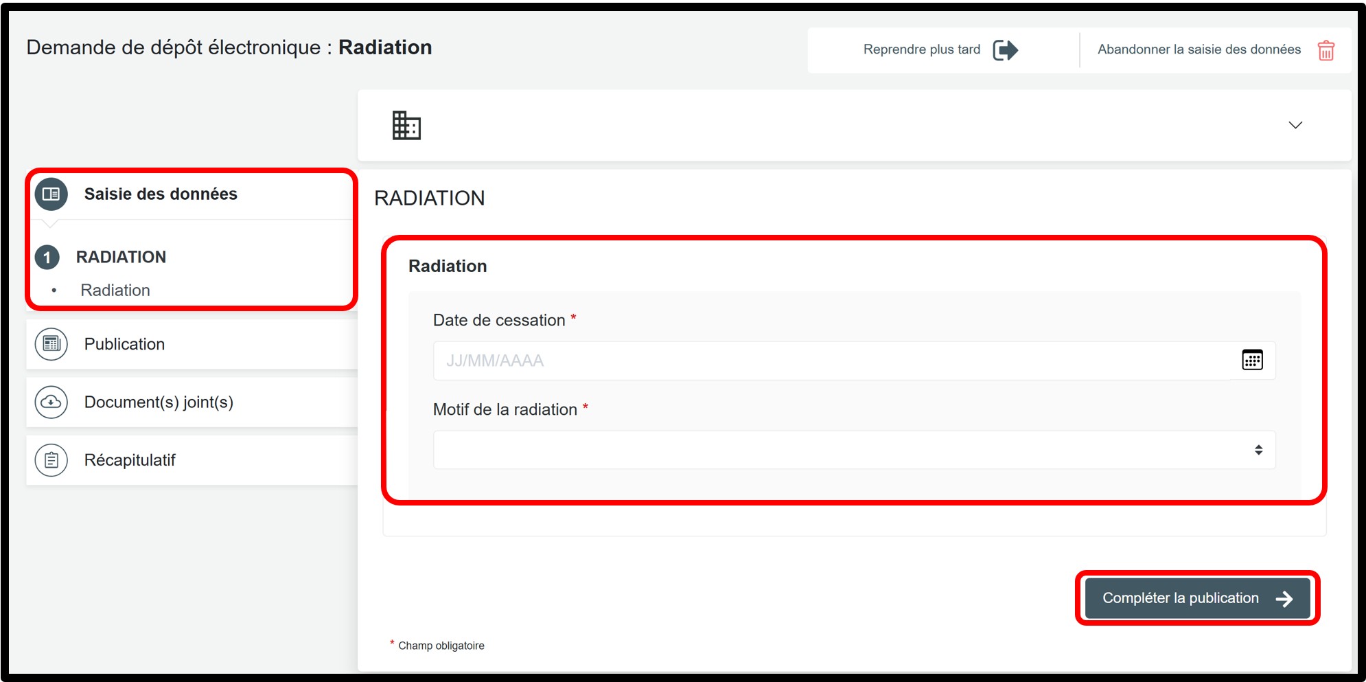 Dans la partie Saisie des données, sélectionnez la rubrique Radiation afin d’indiquer les informations relatives à la date de cessation de l’entité et au motif de la radiation.