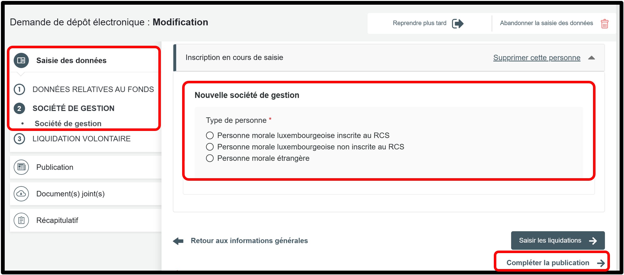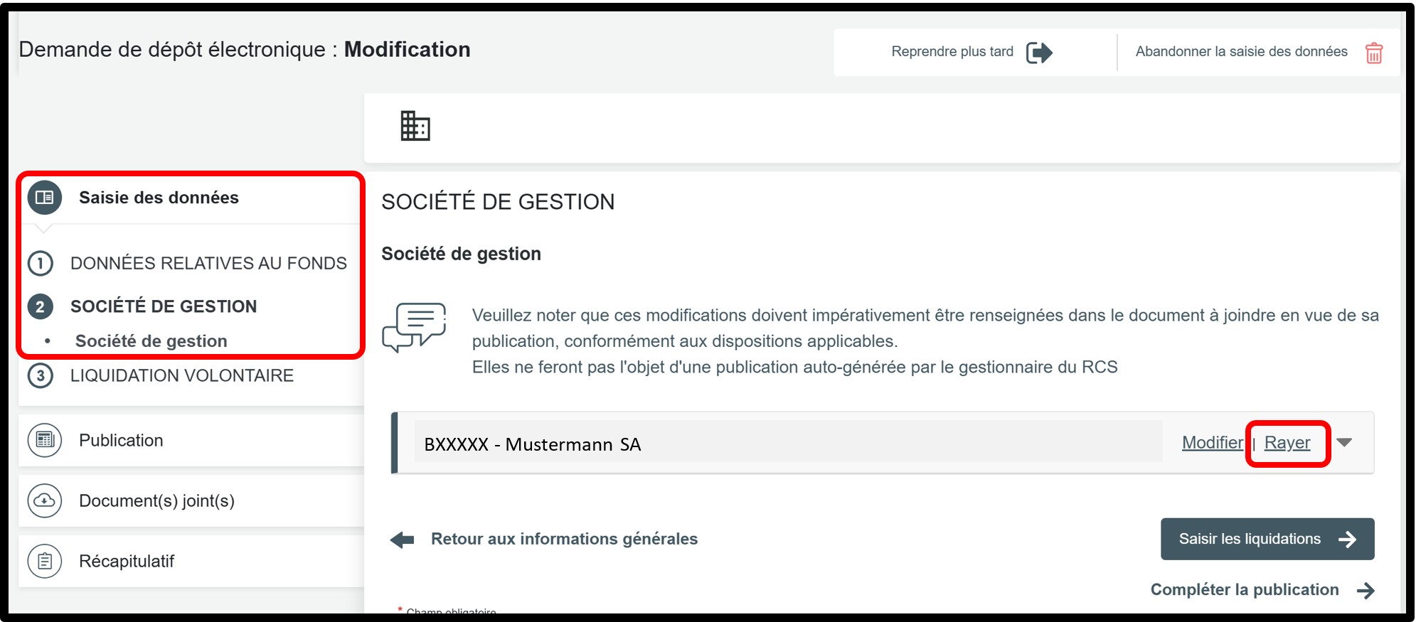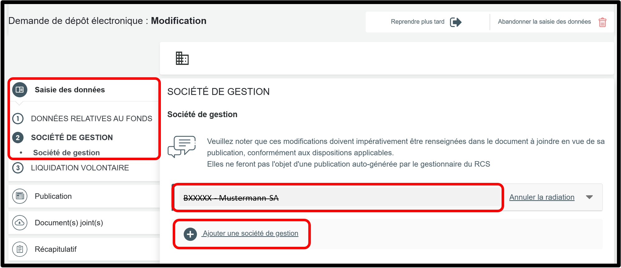 Pour mettre à jour ces informations, vous devez effectuer un dépôt modificatif auprès du RCS. Cela consiste à mettre à jour les informations du fonds en supprimant la société de gestion actuellement inscrite et à ajouter une nouvelle société de gestion autorisée à représenter le fonds et l'engager effectivement.
