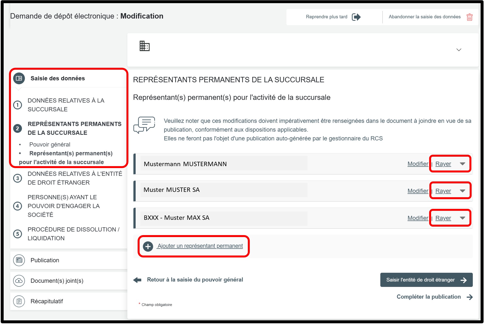 Tous les représentants permanents inscrits comme mandataires pour la ou les succursales ont démissionné de leurs fonctions et ont notifié leur démission auprès du RCS. Si un représentant permanent n’est plus en fonction, vous devez le radier de votre liste de mandataires et inscrire un nouveau représentant permanent pour la succursale concernée. La mise à jour de ces informations permet de refléter correctement la situation de votre entité.