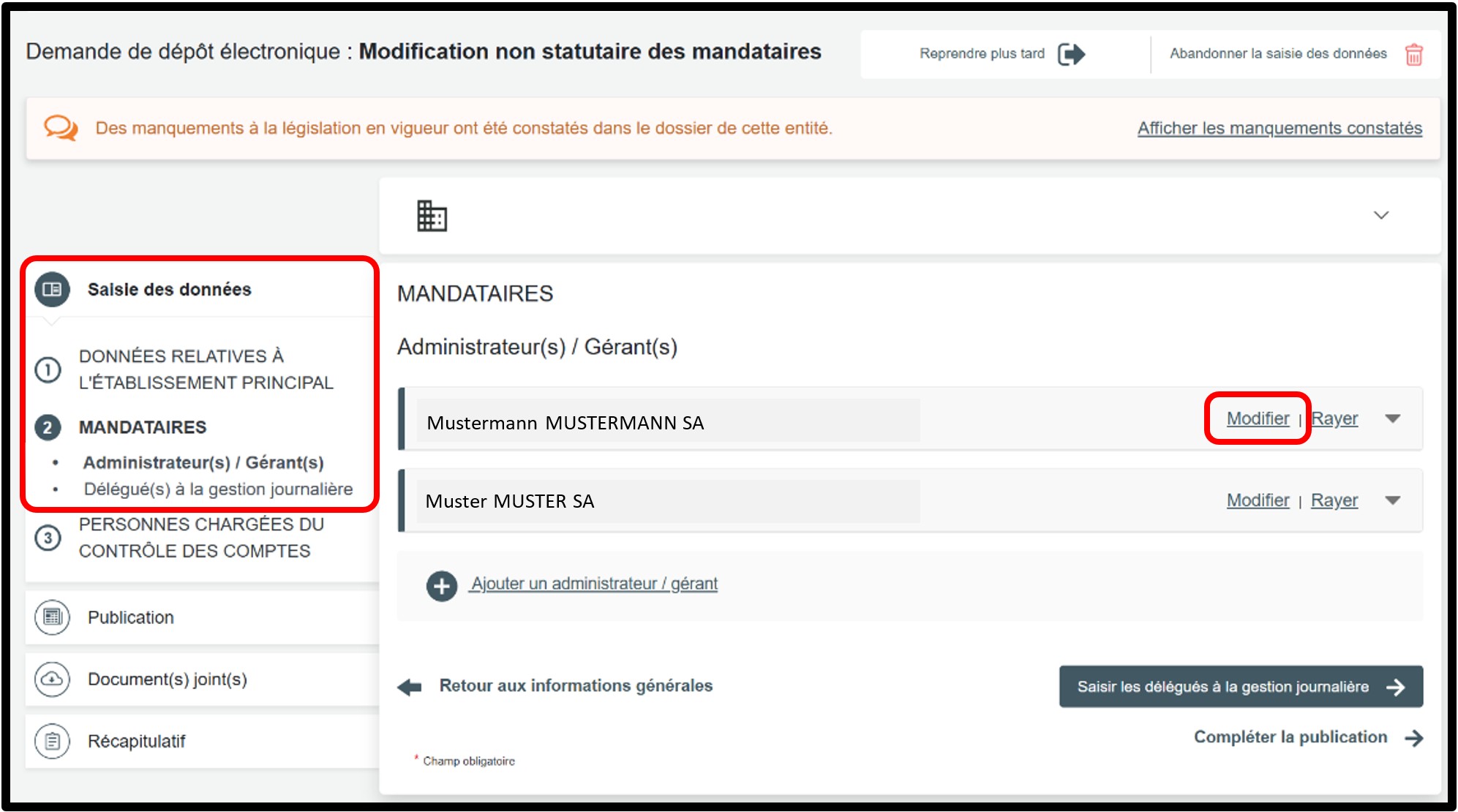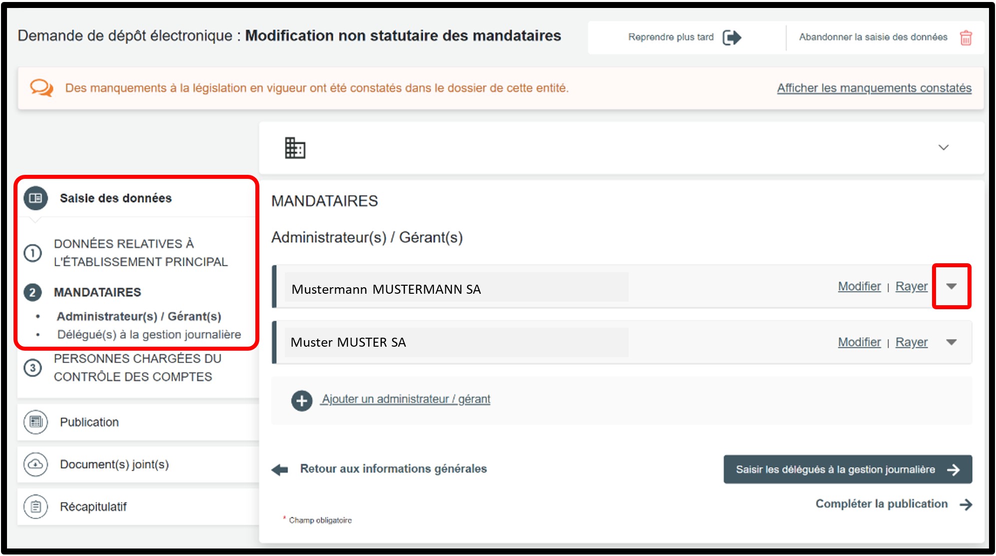 Dans la partie Saisie des données, sélectionnez la rubrique Mandataires pour accéder aux informations à modifier. Cliquez d’abord sur la petite flèche pour afficher les informations du mandataire et identifier le représentant permanent qui a notifié sa démission au RCS.