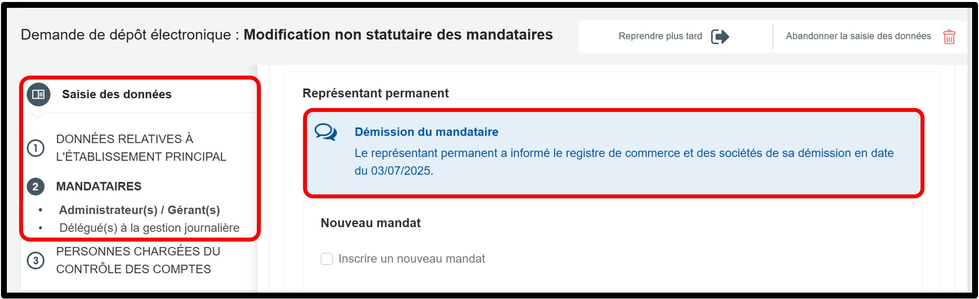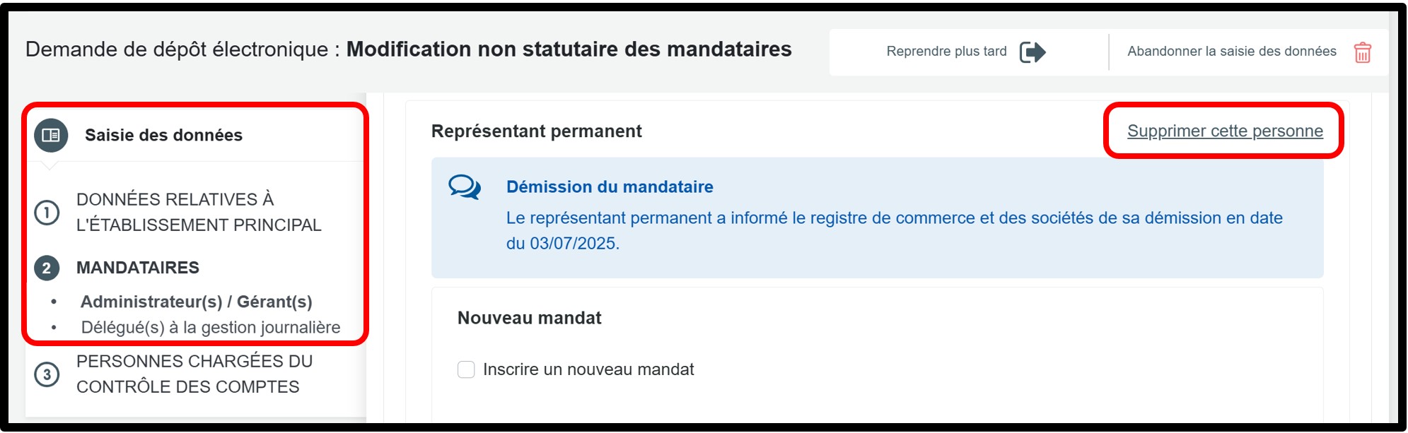 - Le représentant permanent de la personne morale qui a démissionné doit être supprimer de la liste des mandataires, puisqu’il n’est plus en fonction.