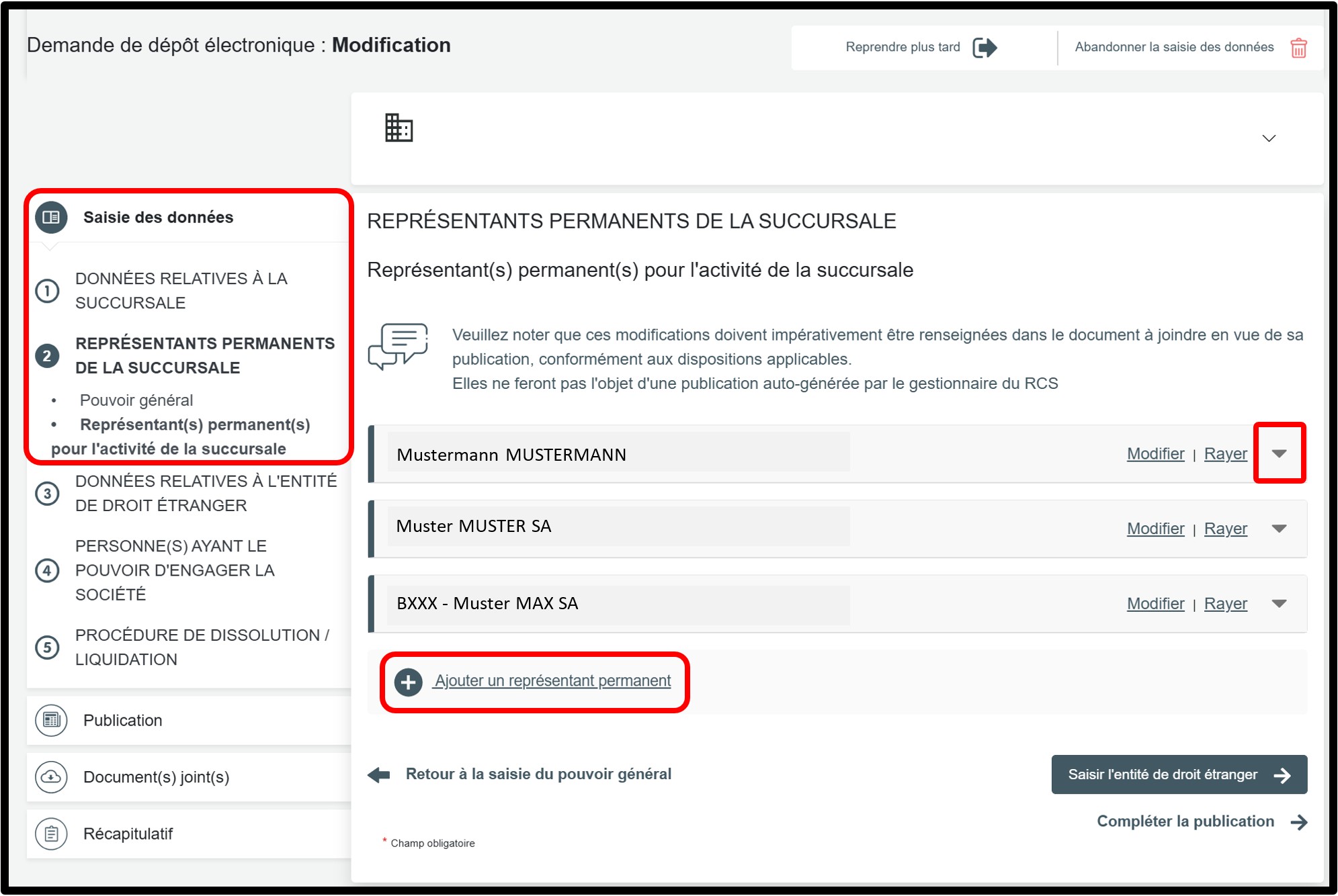 Dans la partie Saisie des données, sélectionnez la rubrique Représentants permanents de la succursale pour accéder aux informations à modifier.