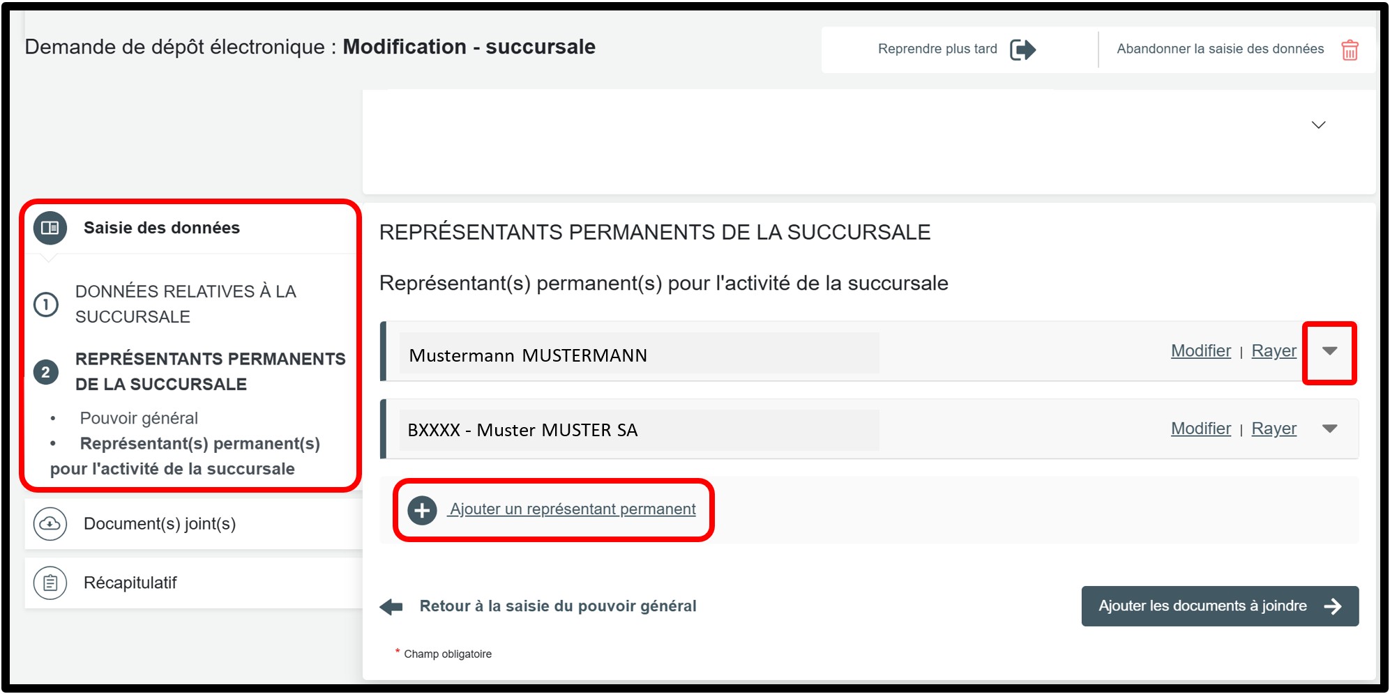 Dans la partie Saisie des données, sélectionnez la rubrique Représentants permanents de la succursale pour accéder aux informations à modifier.
