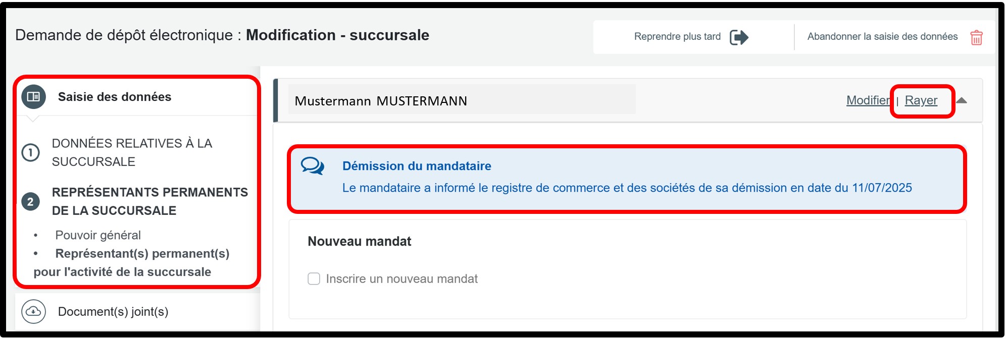 - Le représentant permanent de la succursale qui a démissionné doit être rayer de la liste des mandataires, puisqu’il n’est plus en fonction.