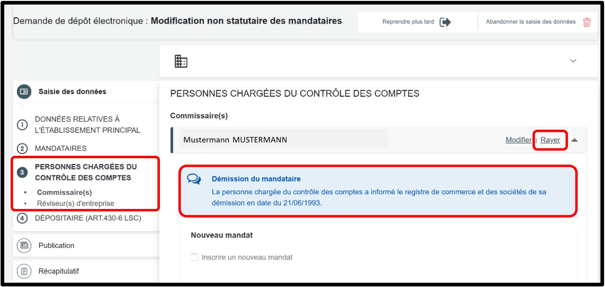 La personne chargée du contrôle des comptes de votre entité a démissionné de ses fonctions et a notifié sa démission auprès du RCS. Puisque cette personne n’est plus en fonction, vous devez la radier de votre liste des personnes chargées du contrôle des comptes et inscrire un nouveau commissaire ou réviseur d'entreprise afin de remplacer celle qui a démissionné. La mise à jour de ces informations permet de refléter correctement la situation de votre entité.