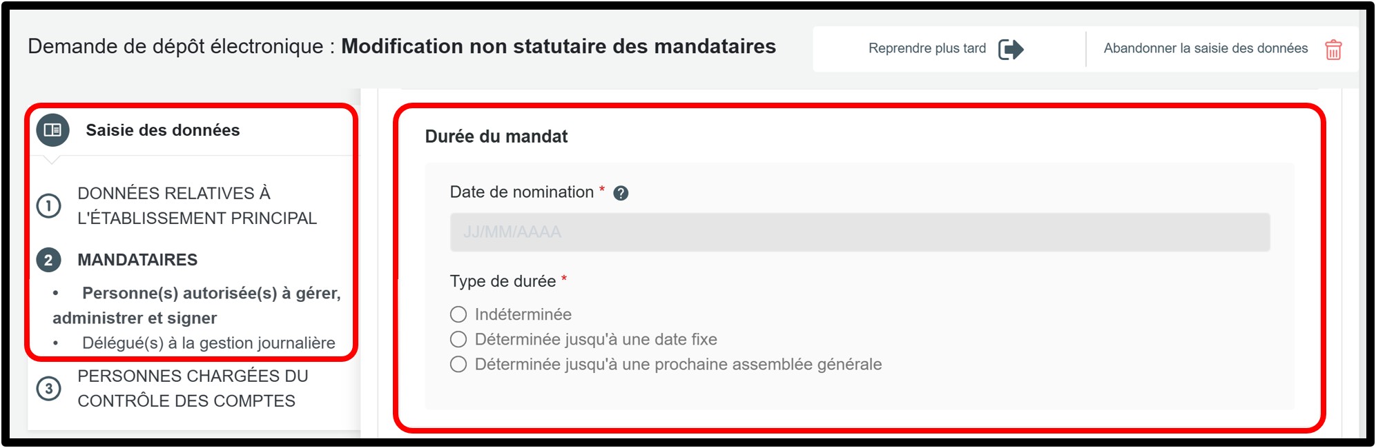 Dans l’exemple présenté dans le cadre des explications fournies, vous pouvez voir, dans la rubrique Durée du mandat, que la durée du mandat n'est pas du tout renseignée.
