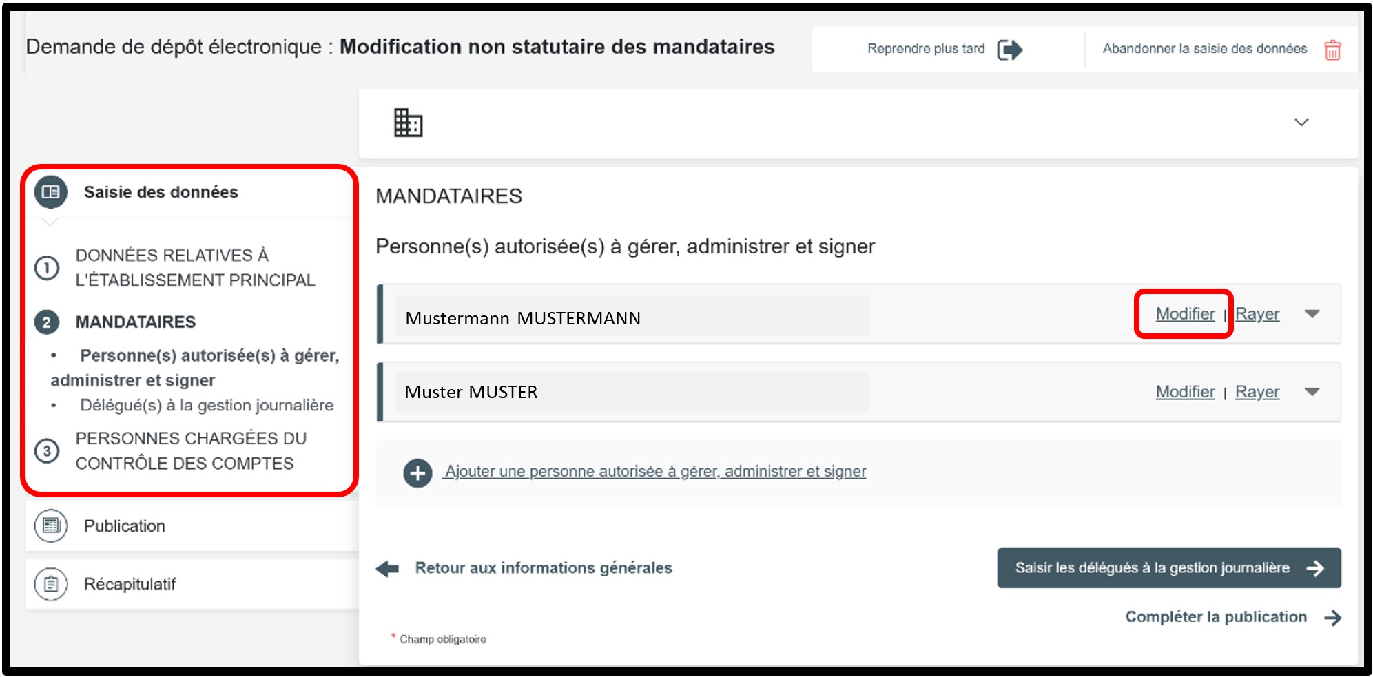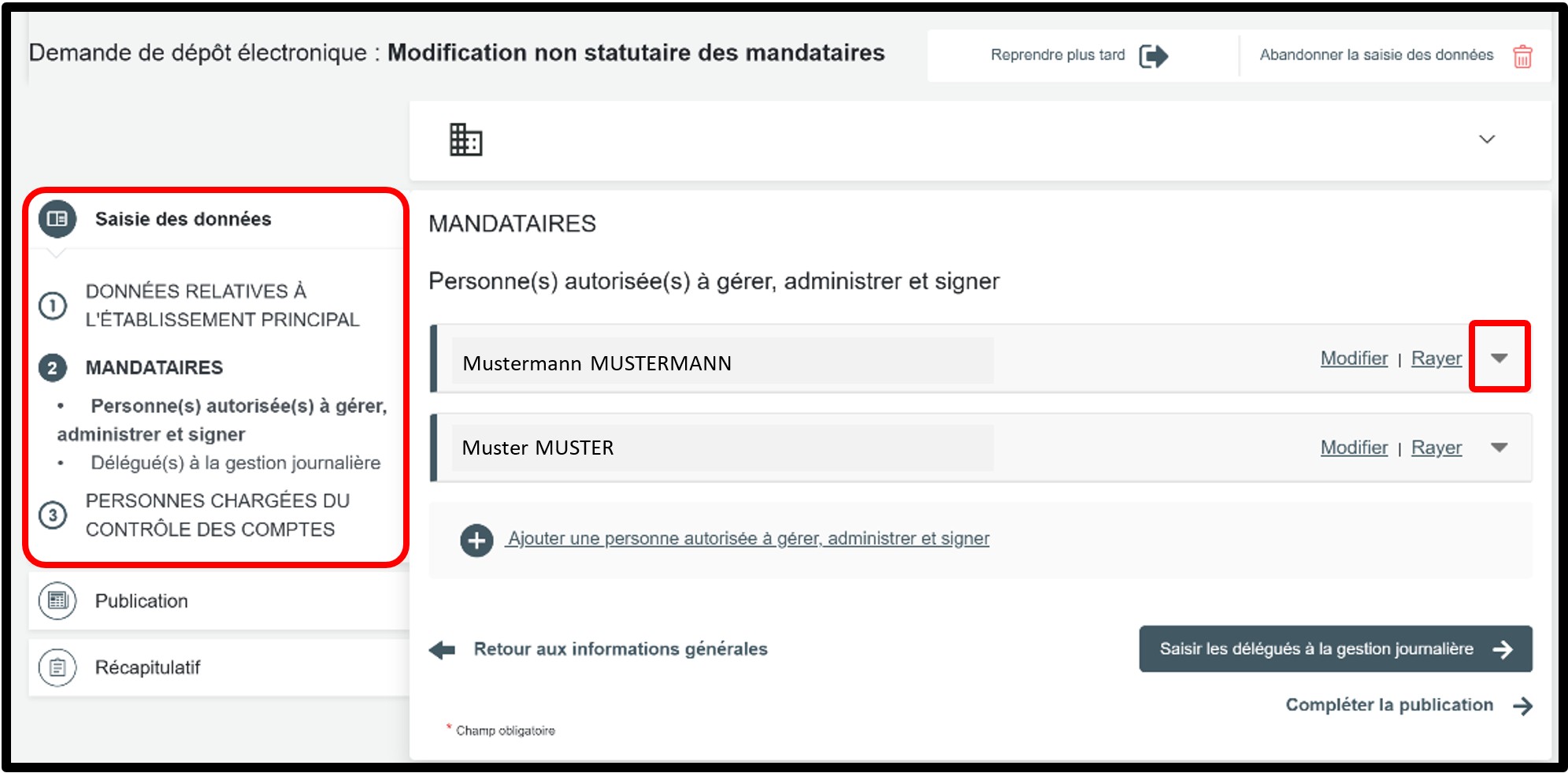 Dans la partie Saisie des données, sélectionnez la rubrique Mandataires pour accéder aux informations à modifier.