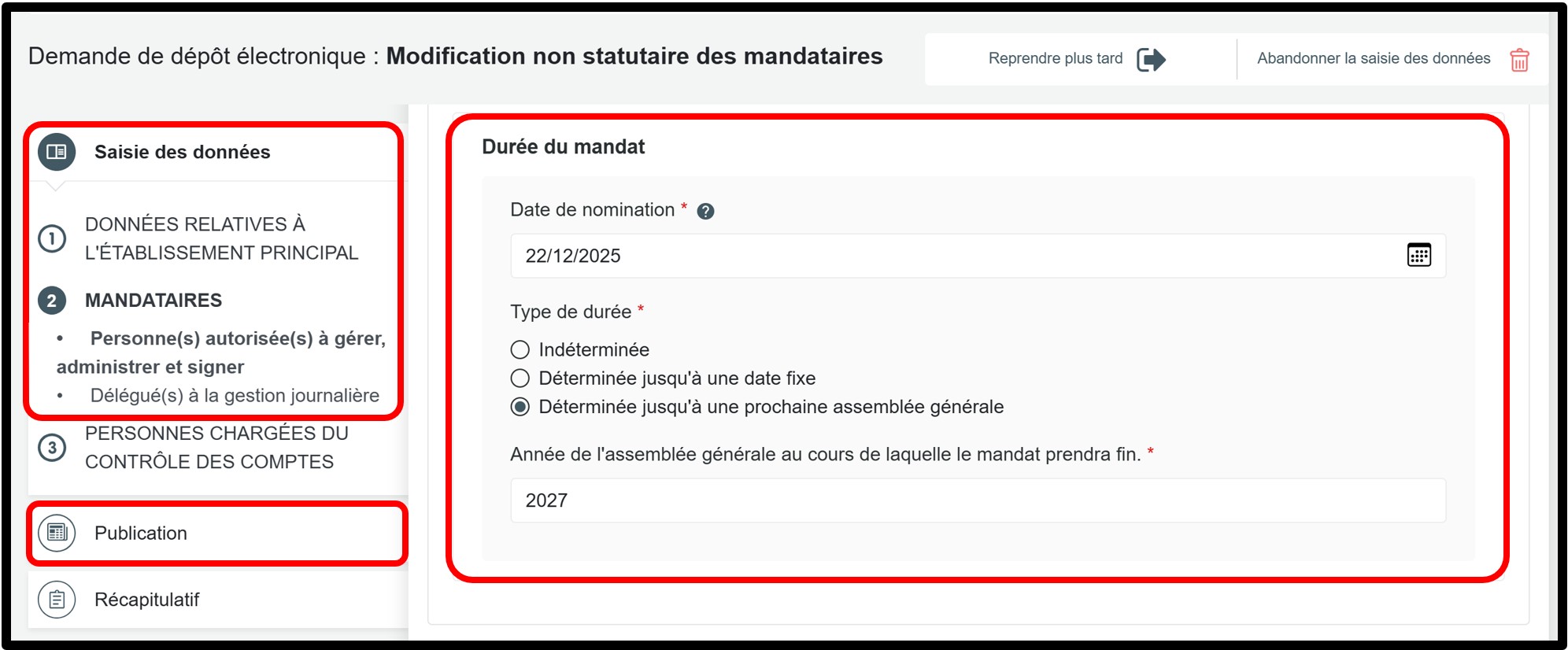 Rendez-vous ensuite dans la rubrique Durée du mandat pour corriger les informations, selon le cas de figure correspondant à la situation de votre entité.