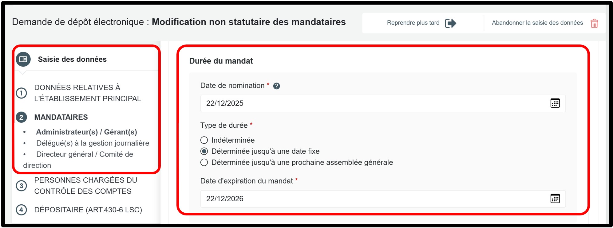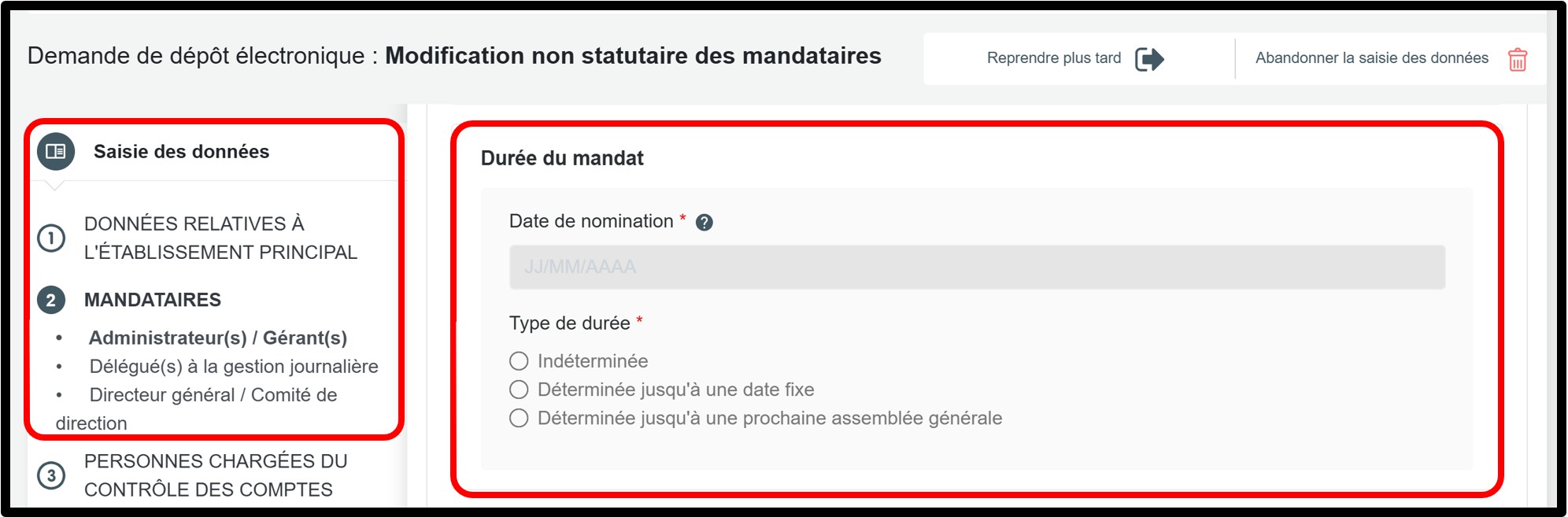 Dans l’exemple présenté dans le cadre des explications fournies, vous pouvez voir, dans la rubrique Durée du mandat, que la durée du mandat n'est pas du tout renseignée.